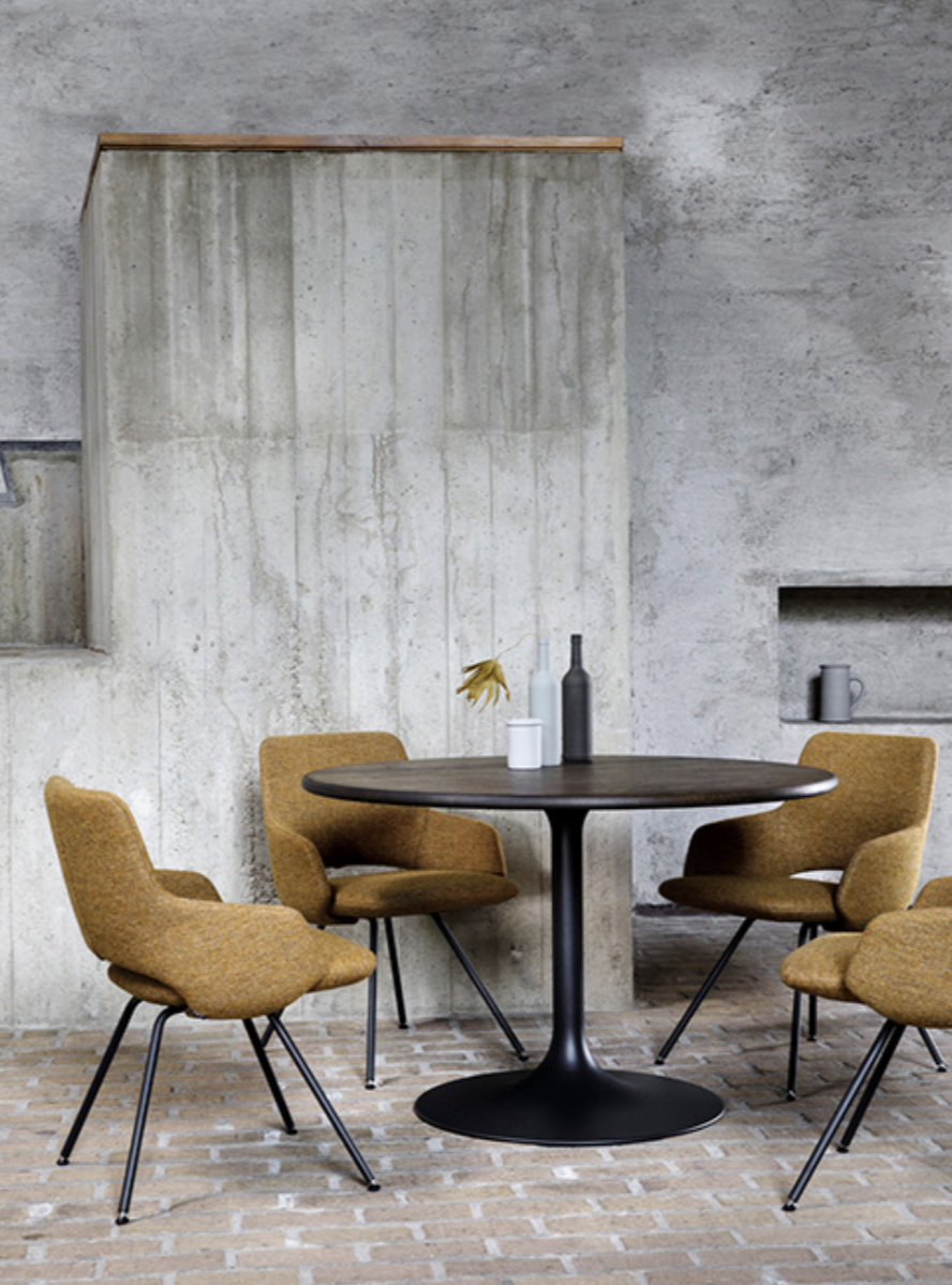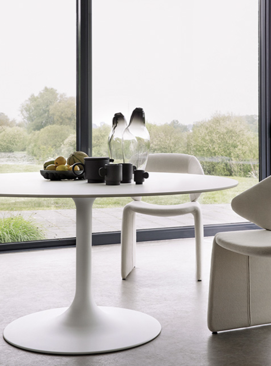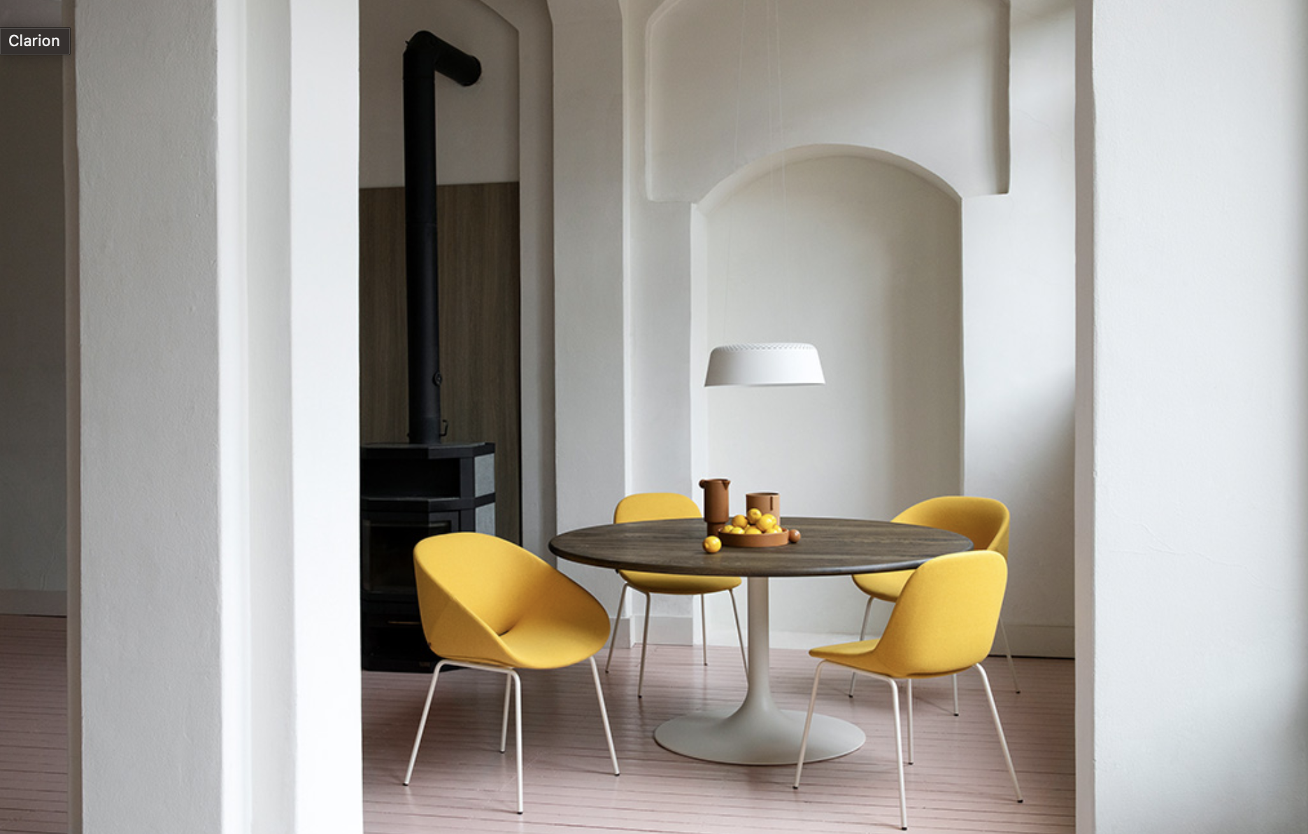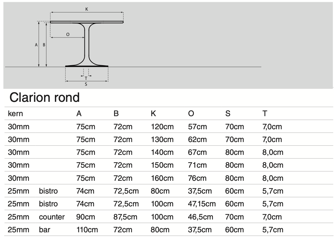 De Clarion eettafel, ontworpen door de Artifort Design Group, is samengesteld als een speelse melodie van twee archetypische trompetvoeten, verbonden door een staander die samen het tafelblad ondersteunen. Dankzij de centrale positie van de trompetvoet biedt de tafel maximale bewegingsvrijheid. Het tafelblad van de Clarion eettafel is verkrijgbaar in verschillende vormen, zoals rond, ovaal of pilvormig, en valt op door de bolgefreesde tafelrand. De Clarion-serie omvat niet alleen eetkamertafels, maar ook vergadertafels, bistrotafels, countertafels, statafels en een serie lagere tafels. Deze veelzijdige serie biedt verschillende opties in afmetingen, kleuren, materialen en afwerkingen, waardoor het mogelijk is om de tafel naar wens aan te passen. Combineer de Clarion met een elegante stoel, een uitnodigende barkruk of luxe vergaderfauteuils, afhankelijk van de setting. Het meest opvallende kenmerk van de Clarion is het metalen onderstel, dat bestaat uit twee archetypische trompetvoeten met daartussen een staander die het tafelblad draagt. Het tafelblad is verkrijgbaar in ronde, ovale of pilvormige varianten en heeft een bolgefreesde tafelrand. Er zijn verschillende materiaalopties, waaronder massief eikenhout, multiplex met een eikenfineer toplaag, of laminaat Fenix. Voor een extra luxe uitstraling kan worden gekozen voor volkern Arpa Fenix van slechts 12 mm dik. Het onderstel is afgewerkt met een structuur poedercoat en er is een optionele mogelijkheid voor elektrificatie in de Clarion tafel met een boat-shaped tafelblad. De vanaf prijs is gebaseerd op de tafel uitgevoerd in de afmeting ø 140cm met een 24mm multiplex basis en een toplaag van laminaat Arpa Fenix.