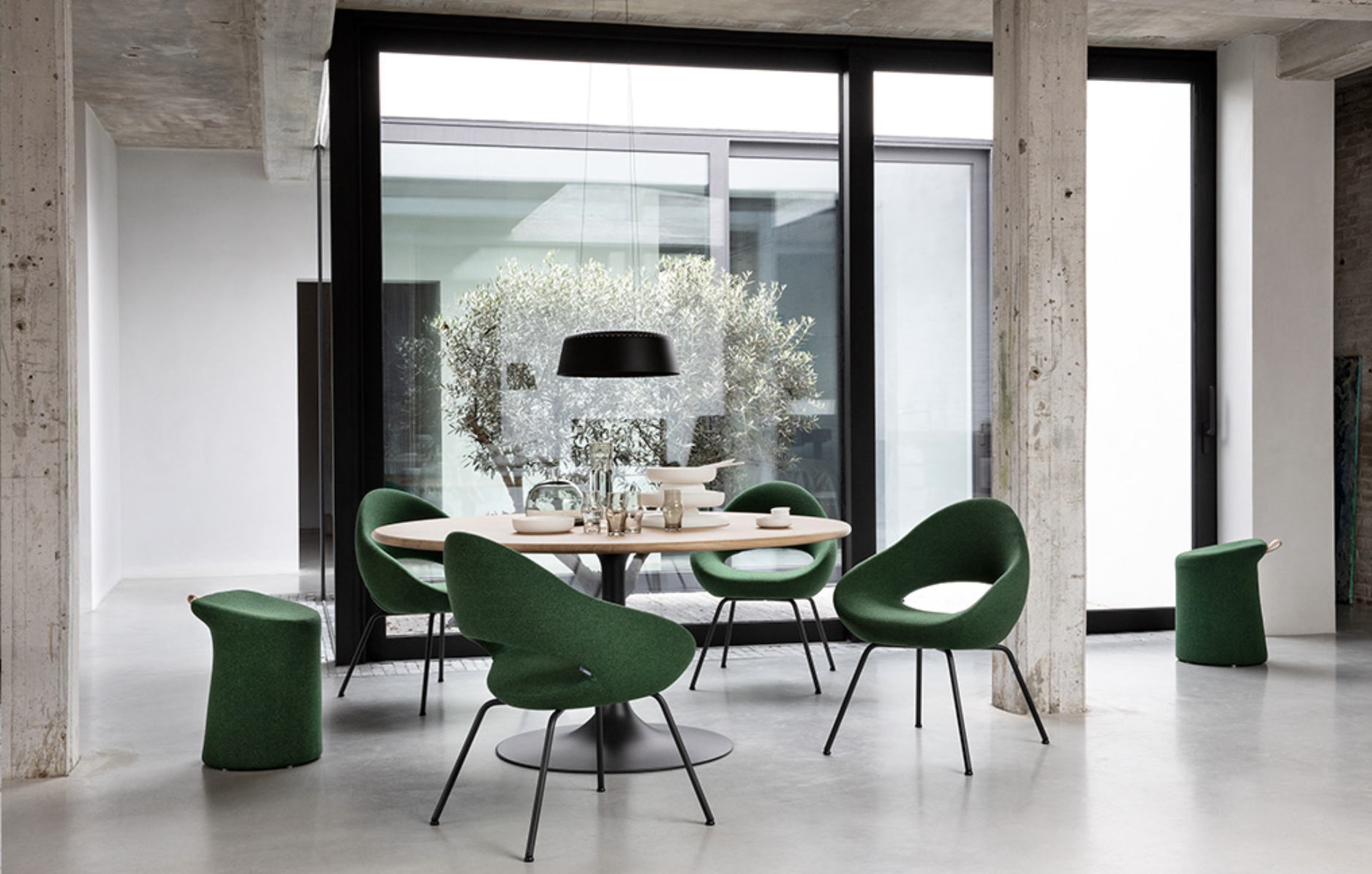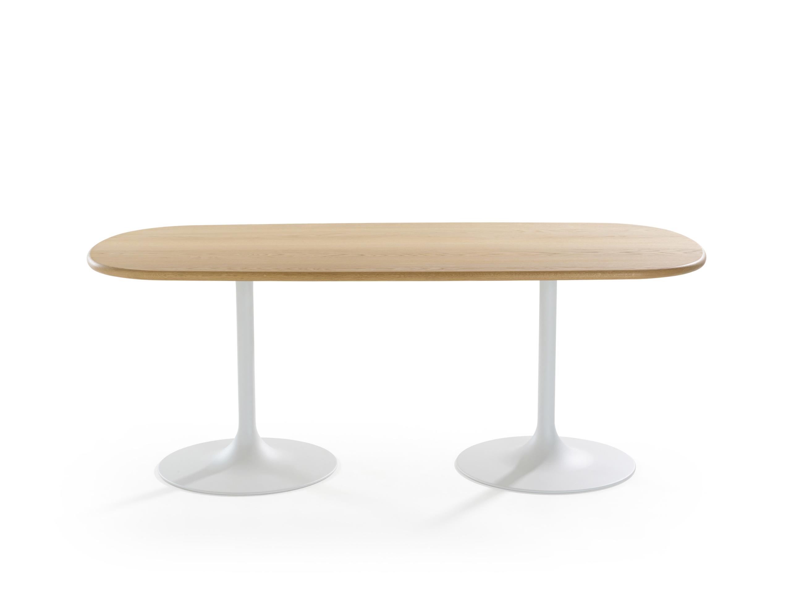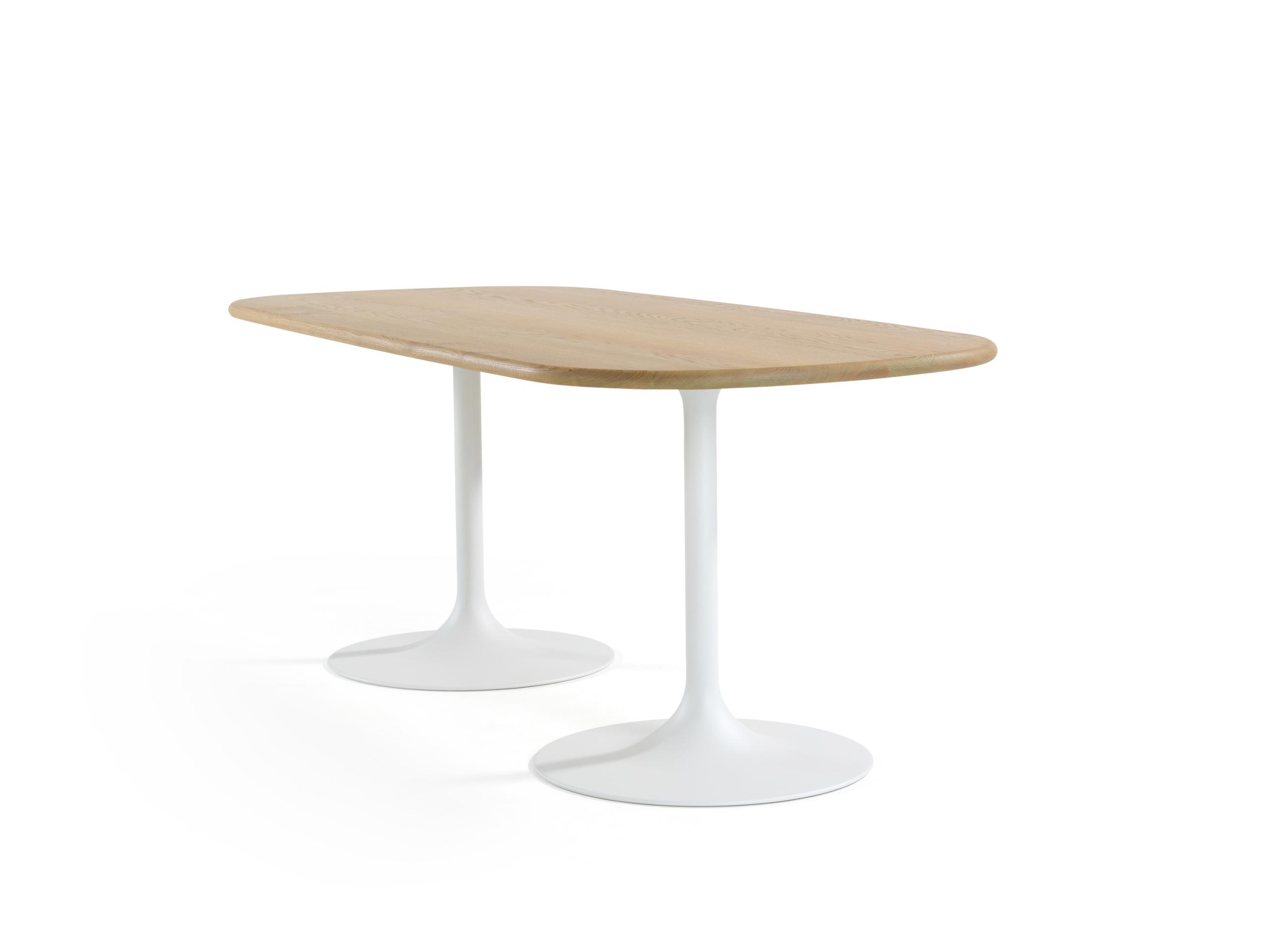 De Clarion eettafel, ontworpen door de Artifort Design Group, is samengesteld als een speelse melodie van twee archetypische trompetvoeten, verbonden door een staander die samen het tafelblad ondersteunen. Dankzij de centrale positie van de trompetvoet biedt de tafel maximale bewegingsvrijheid. Het tafelblad van de Clarion eettafel is verkrijgbaar in verschillende vormen, zoals rond, ovaal of pilvormig, en valt op door de bolgefreesde tafelrand. De Clarion-serie omvat niet alleen eetkamertafels, maar ook vergadertafels, bistrotafels, countertafels, statafels en een serie lagere tafels. Deze veelzijdige serie biedt verschillende opties in afmetingen, kleuren, materialen en afwerkingen, waardoor het mogelijk is om de tafel naar wens aan te passen. Combineer de Clarion met een elegante stoel, een uitnodigende barkruk of luxe vergaderfauteuils, afhankelijk van de setting. Het meest opvallende kenmerk van de Clarion is het metalen onderstel, dat bestaat uit twee archetypische trompetvoeten met daartussen een staander die het tafelblad draagt. Het tafelblad is verkrijgbaar in ronde, ovale of pilvormige varianten en heeft een bolgefreesde tafelrand. Er zijn verschillende materiaalopties, waaronder massief eikenhout, multiplex met een eikenfineer toplaag, of laminaat Fenix. Voor een extra luxe uitstraling kan worden gekozen voor volkern Arpa Fenix van slechts 12 mm dik. Het onderstel is afgewerkt met een structuur poedercoat en er is een optionele mogelijkheid voor elektrificatie in de Clarion tafel met een boat-shaped tafelblad. De vanaf prijs is gebaseerd op de tafel uitgevoerd in de afmeting ø 140cm met een 24mm multiplex basis en een toplaag van laminaat Arpa Fenix.