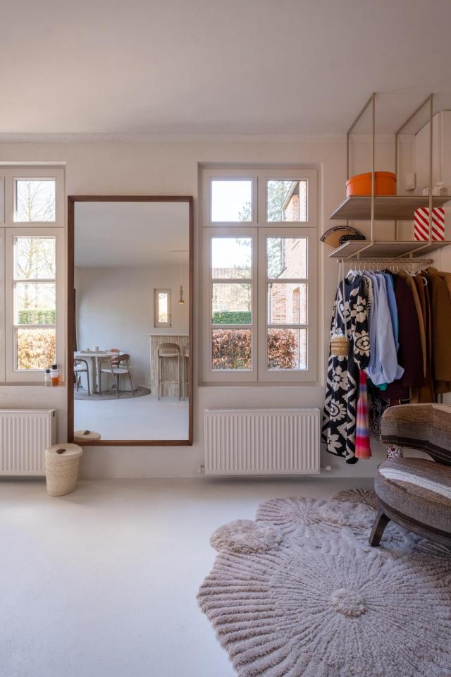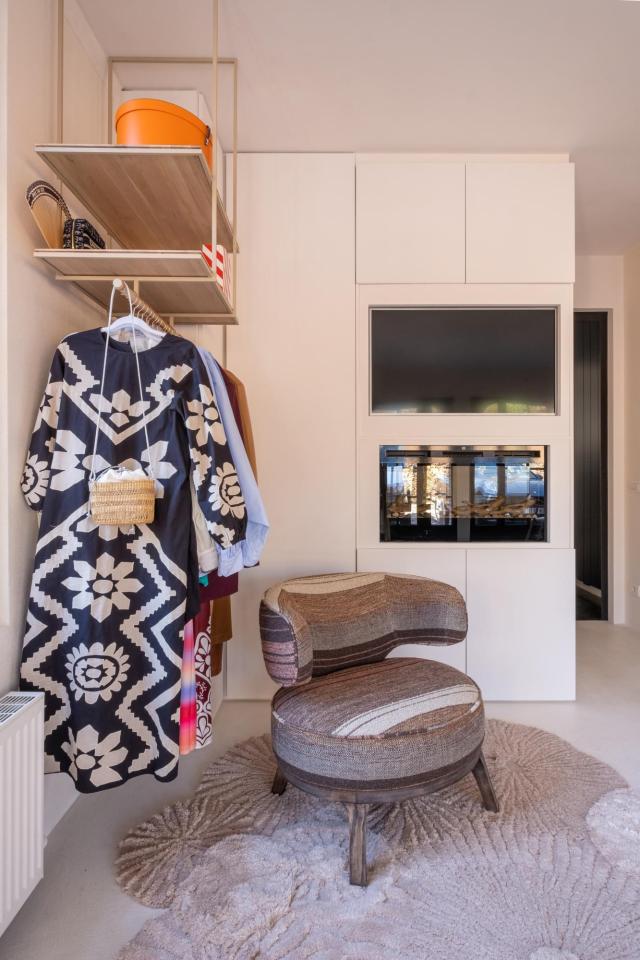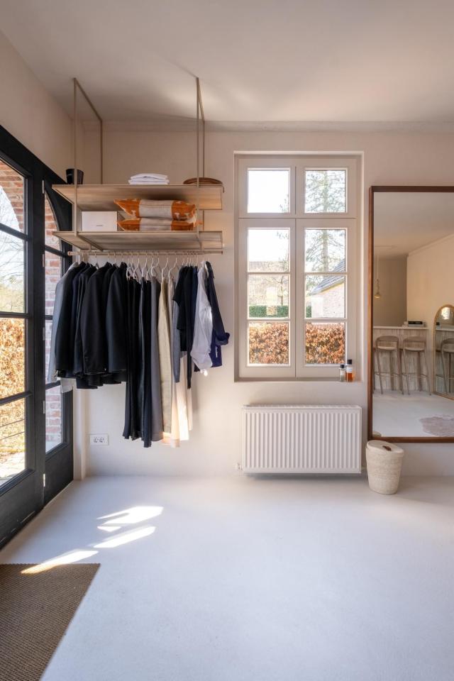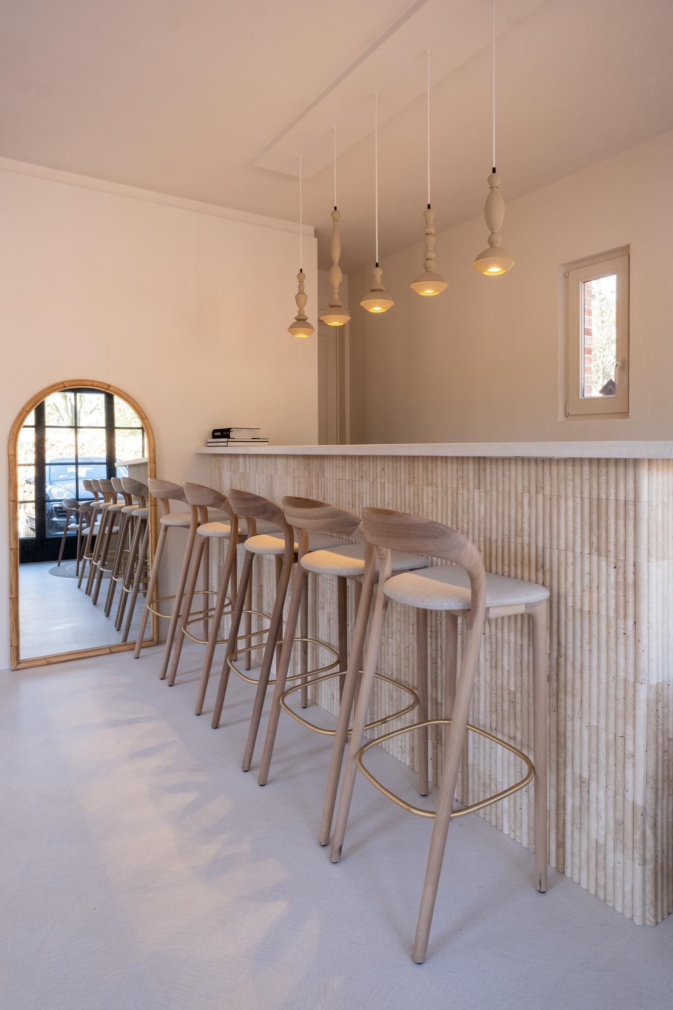Karien heeft de studio ingericht met oog voor functionaliteit, warmte en elegantie. Op maat ontworpen kledingrekken bieden Lonneke een perfecte plek om haar collectie te presenteren. De bar, bekleed met Travertin Tiles van Marba Tegels en met het blad afgewerkt door Texture Painting, vormt het hart van de ruimte. Hiervoor kozen we stijlvolle notenhouten barkrukken van Artisan, model Neva Light, en daarboven hangen hanglampen van Jacco Maris, speciaal op kleur gemaakt om het geheel harmonieus af te ronden.