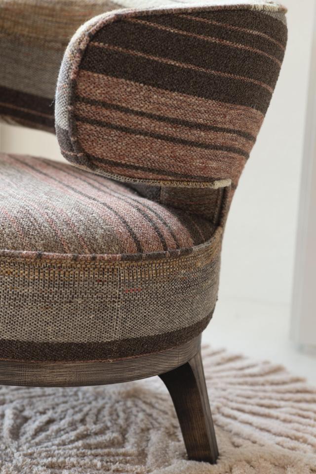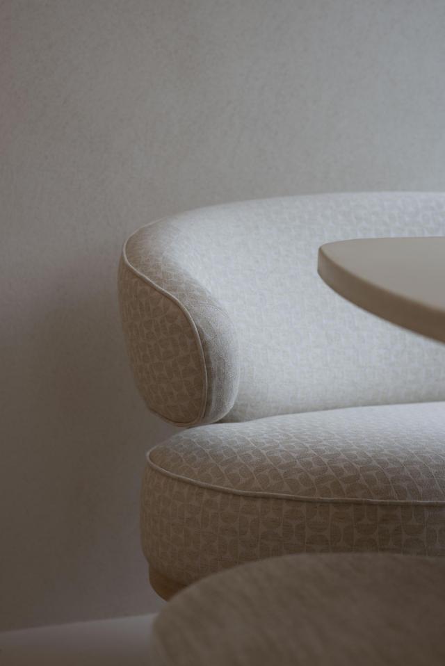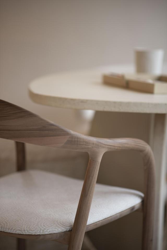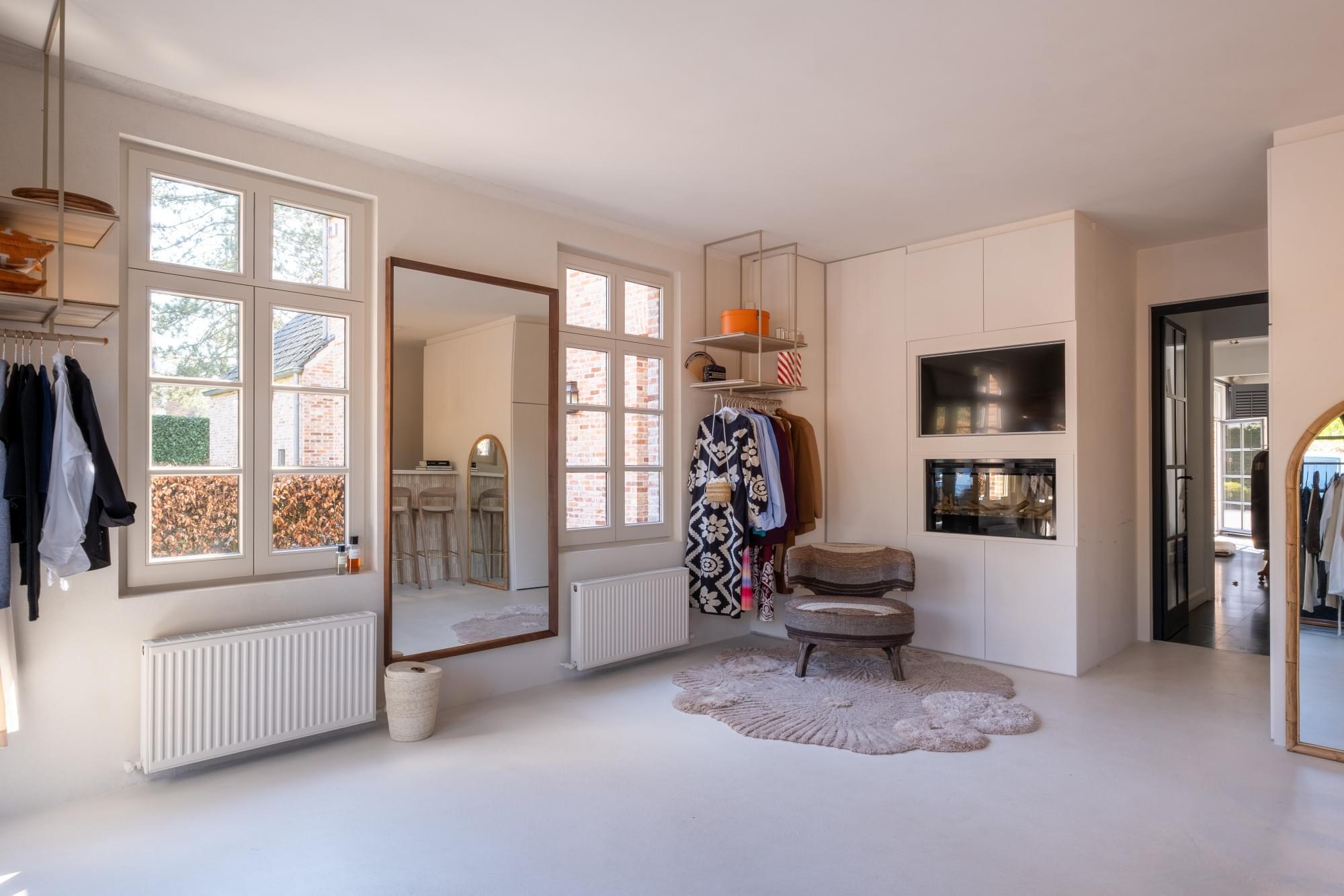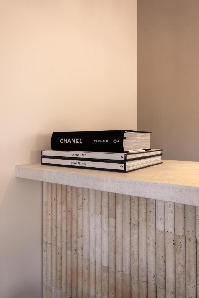 Karien heeft de studio ingericht met oog voor functionaliteit, warmte en elegantie. Op maat ontworpen kledingrekken bieden Lonneke een perfecte plek om haar collectie te presenteren. De bar, bekleed met Travertin Tiles van Marba Tegels en met het blad afgewerkt door Texture Painting, vormt het hart van de ruimte. Hiervoor kozen we stijlvolle notenhouten barkrukken van Artisan, model Neva Light, en daarboven hangen hanglampen van Jacco Maris, speciaal op kleur gemaakt om het geheel harmonieus af te ronden.