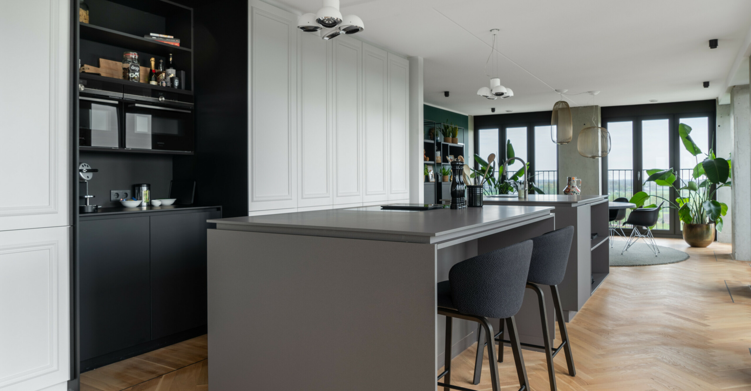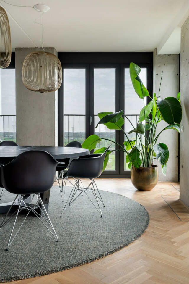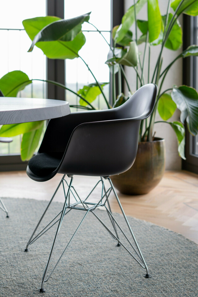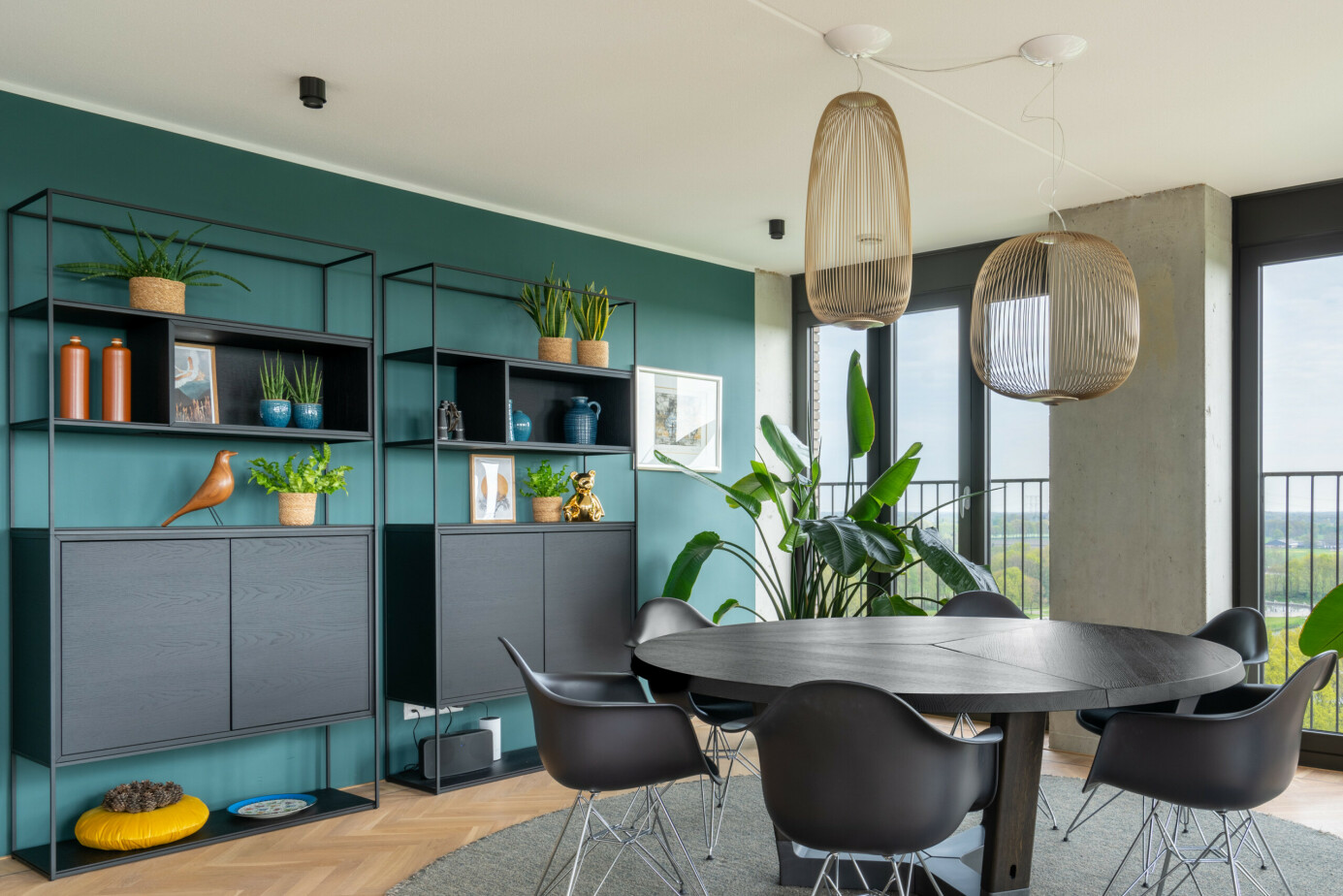 ‘Er ontstond een fijn contact’, vertelt Kevin. ‘We overlegden over wat we zouden bewaren en wat er vernieuwd moest worden. De houten vloer en de keuken mochten blijven. Ook het petrol blauw op de muren sprak hen aan, dus die kleur gebruikten we als uitgangspunt. De bewoners brachten spullen mee die tijdloos mooi waren, zoals de eetkamerstoelen van Vitra. We maakte er een mooi compleet plaatje van met meubels van onder andere Arco, Beek Collection en CS Rugs.’