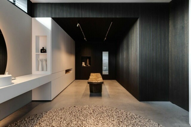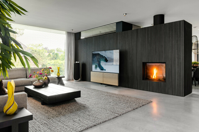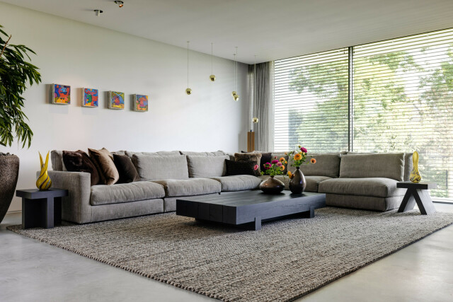 In de leefkeuken kwam een gezellige eethoek, met stoelen en eetkamerbanken van Piet Boon en Walter Knoll. ‘Ook de zithoek werd super comfortabel ingericht’, vervolgt Marjon. ‘Mijn interieurhart ging sneller kloppen bij de mix van mooie merken die ik hiervoor mocht inzetten. We kozen voor zitmeubelen van Linteloo, Label en Verzelloni plus een lekkere lounge chair van Vitra. Die combineerden we met tafels van Van Rossum, Gelderland en Cassina. De wollige karpetten van De Munk en CS Rugs voegen een stukje extra warmte en geluidsdemping toe.’