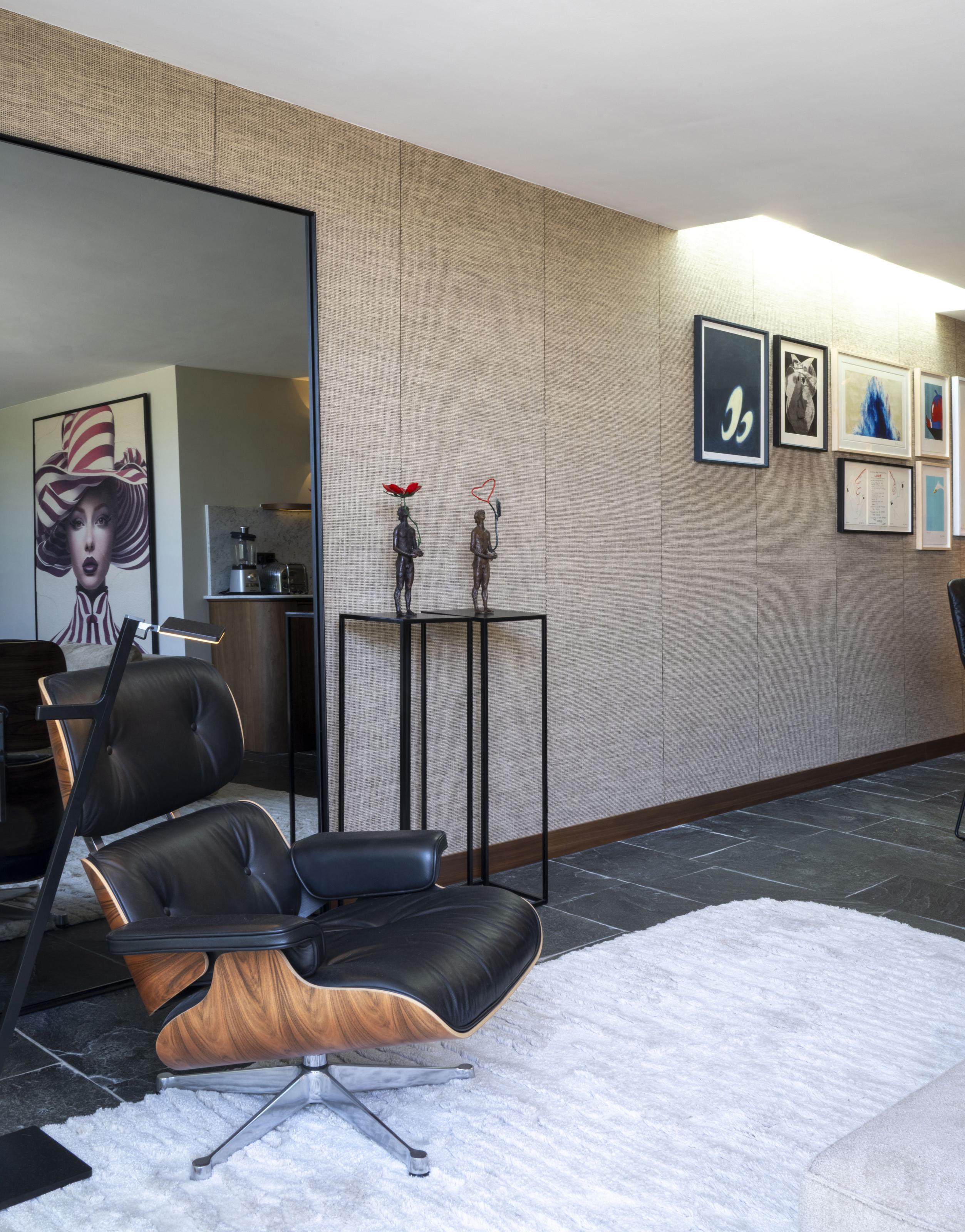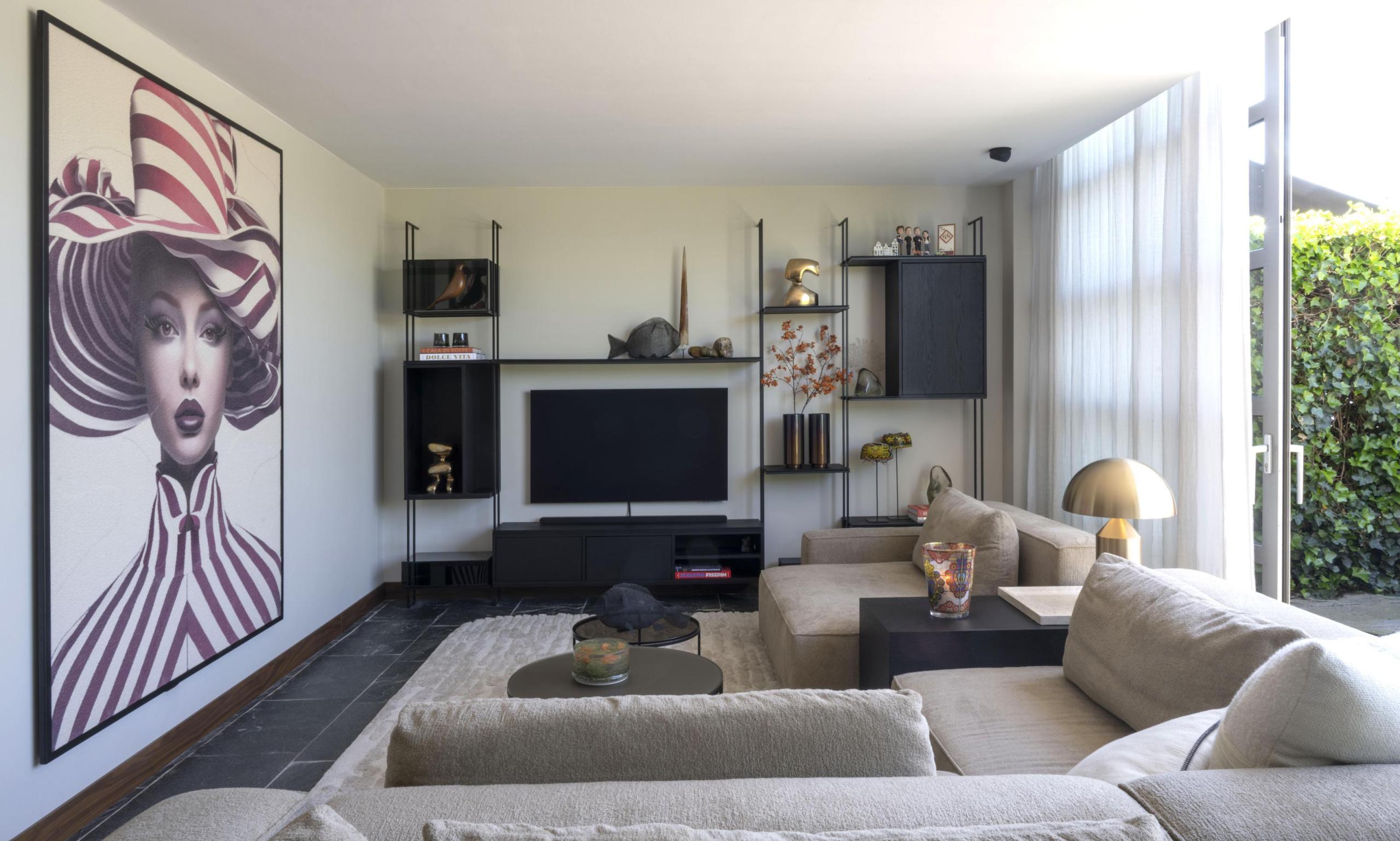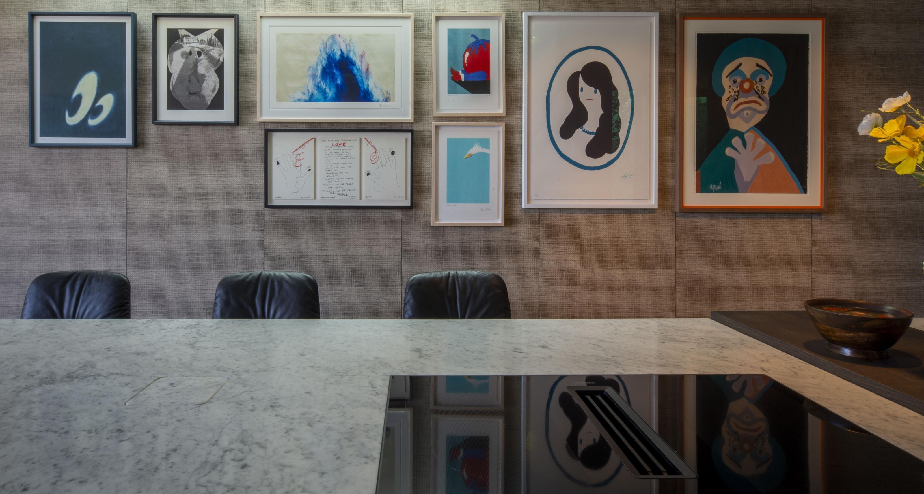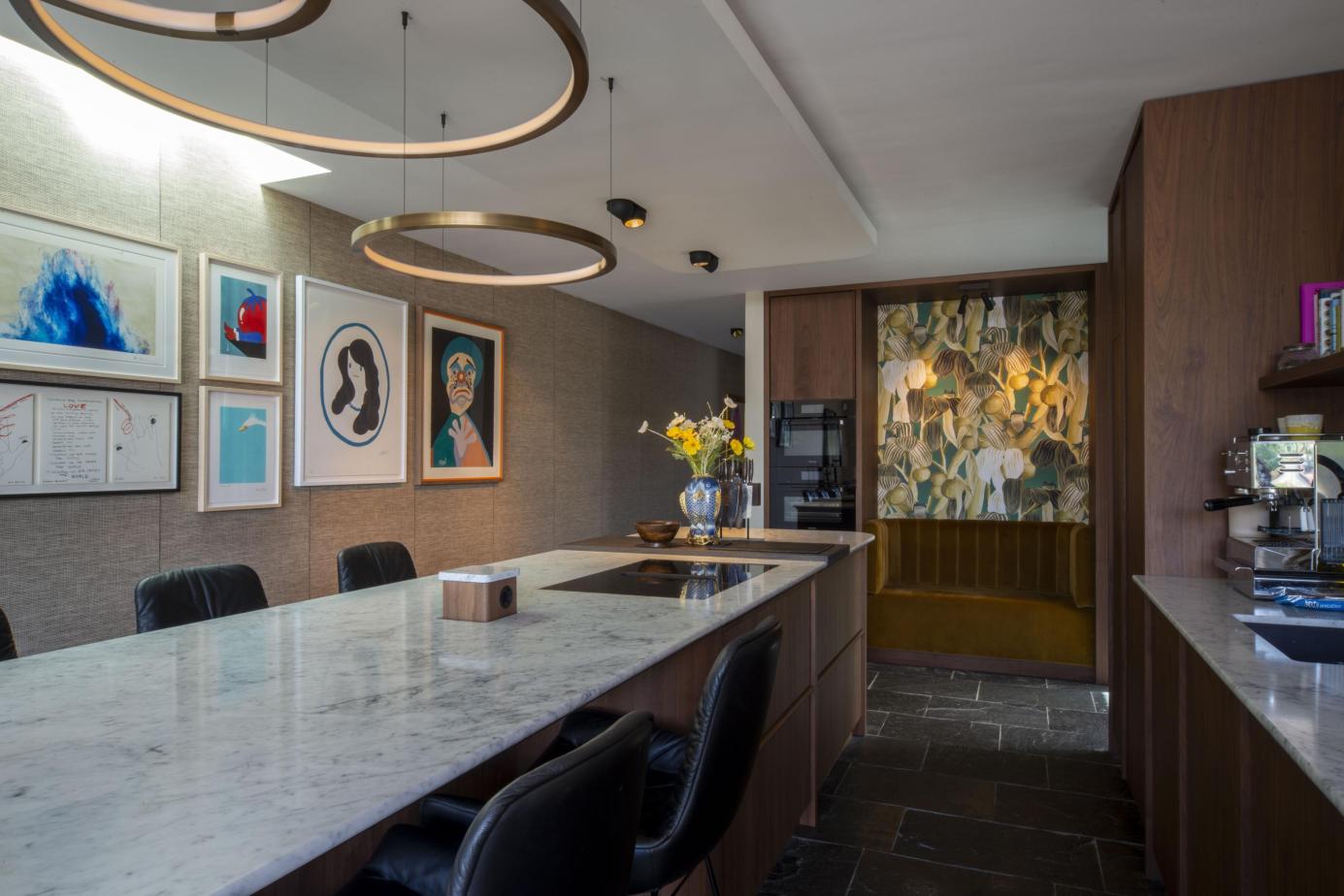 De warm notenhouten keuken nodigt uit tot uitgebreid koken en gezellig borrelen, zowel aan het eiland als op het bijpassende maatwerk zitbankje. Het behang op de muur achter de keuken versterkt de kunstcollectie, terwijl in de woonkamer een groot kunstwerk, geprint op een karpet, het centrale punt vormt. Een maatwerk tv-kast biedt bovendien stijlvolle opbergruimte voor accessoires.