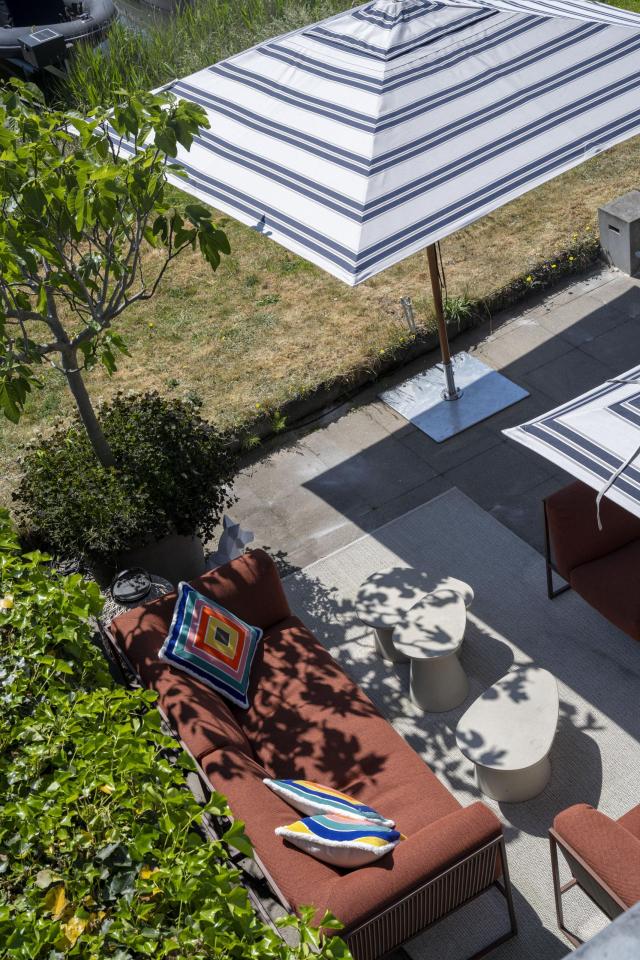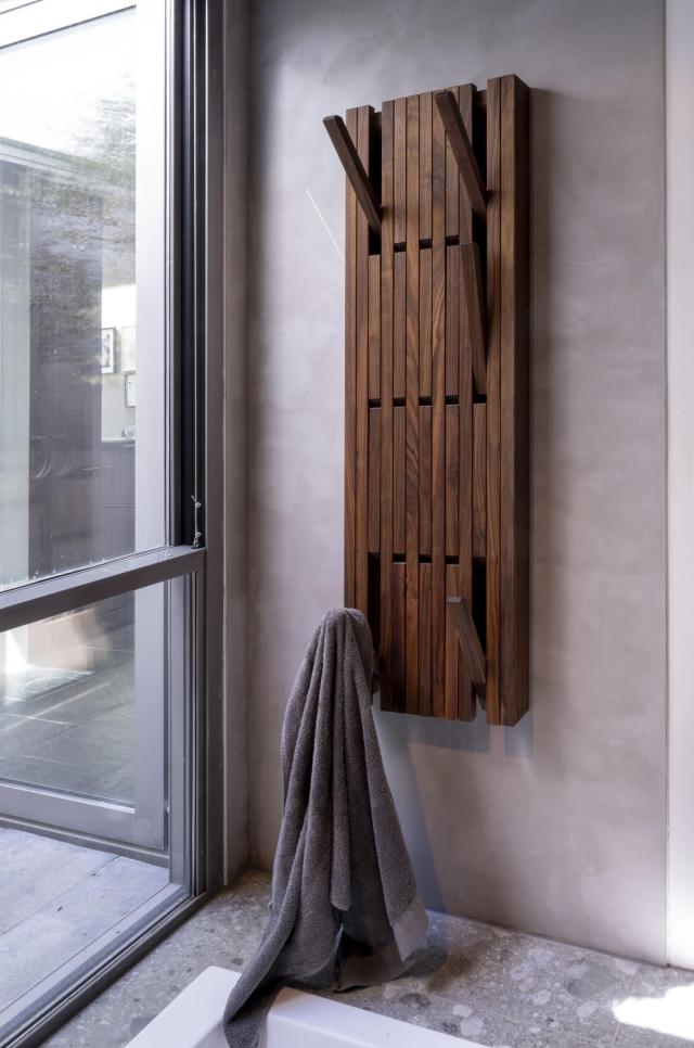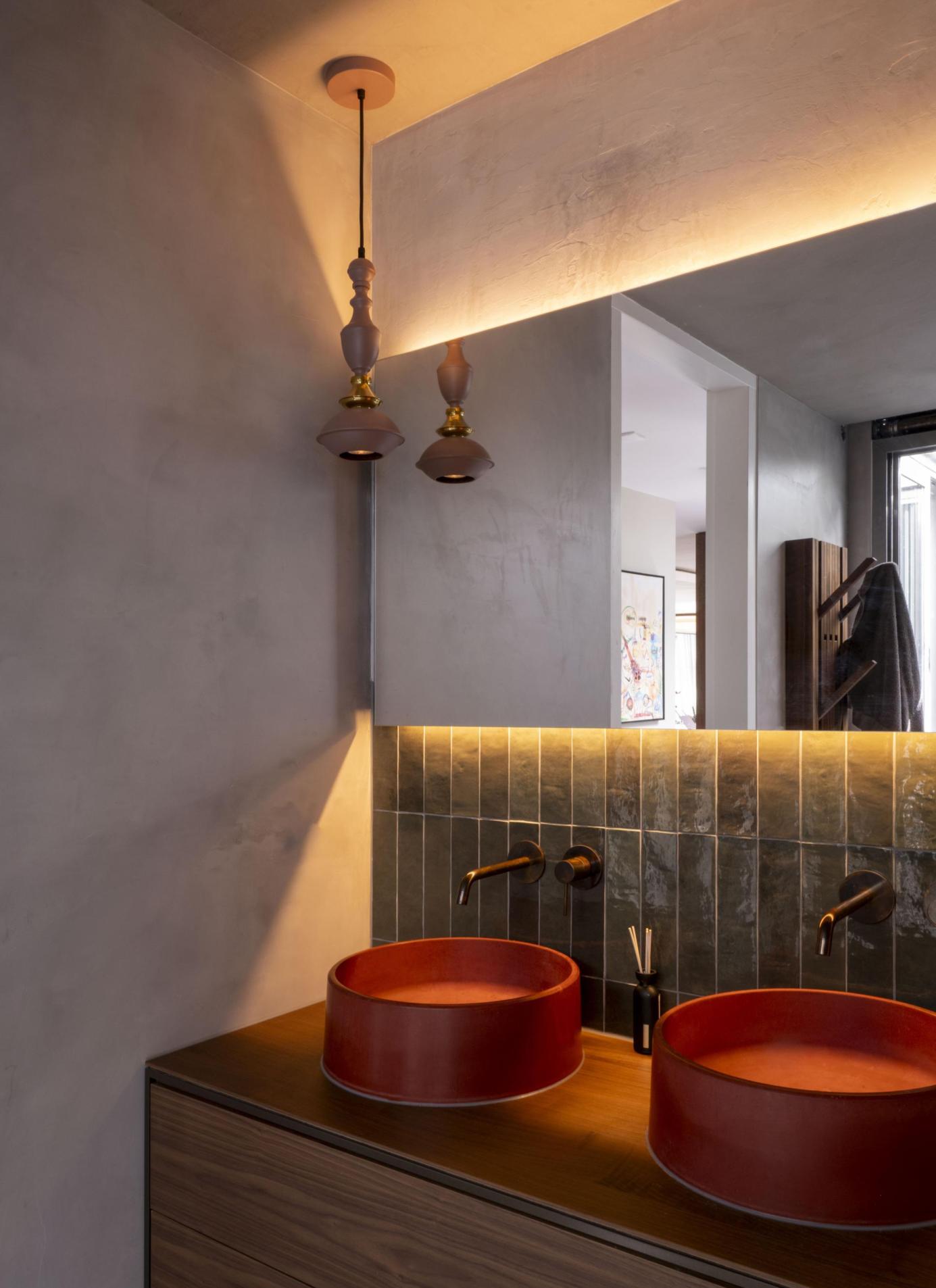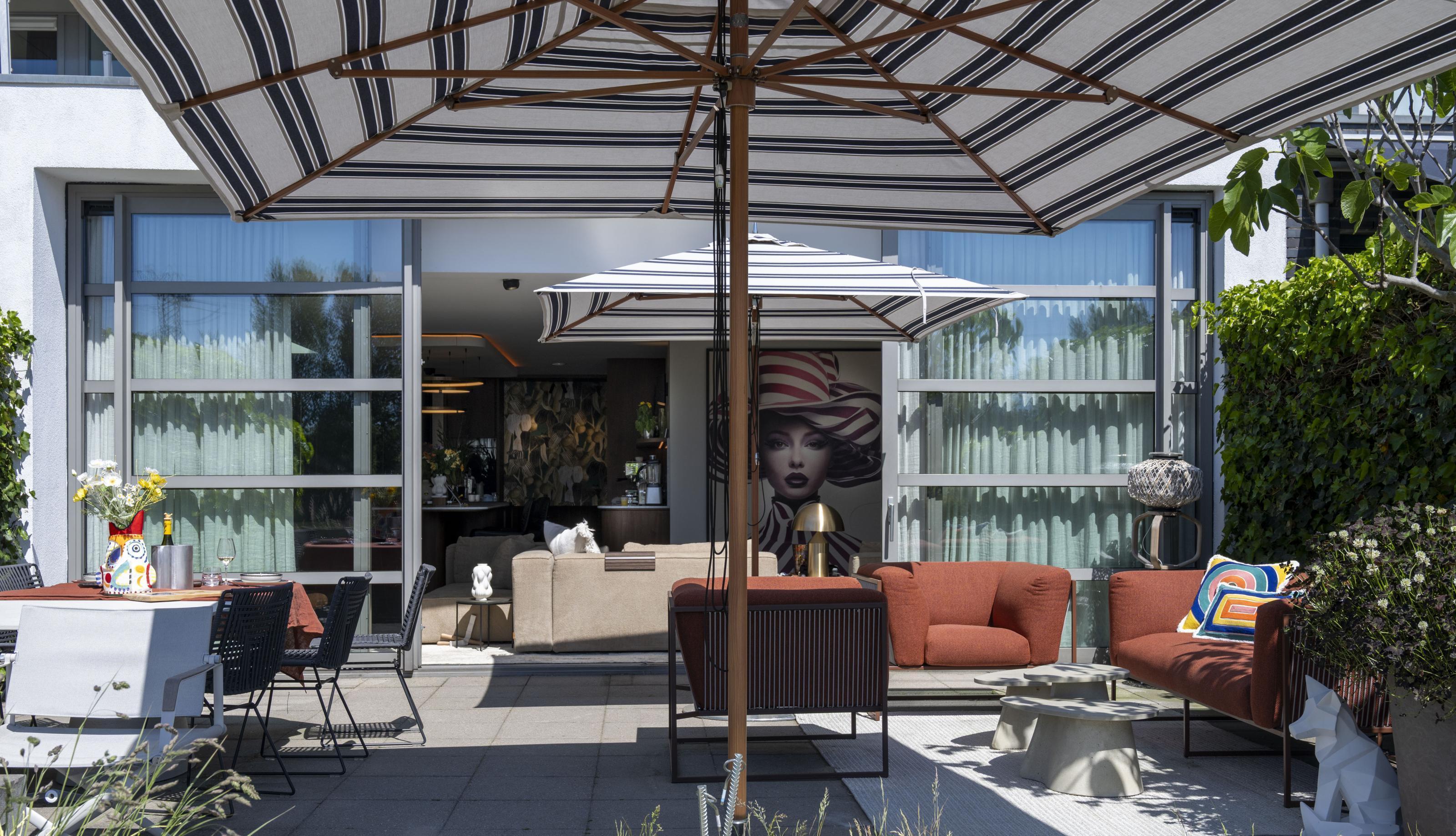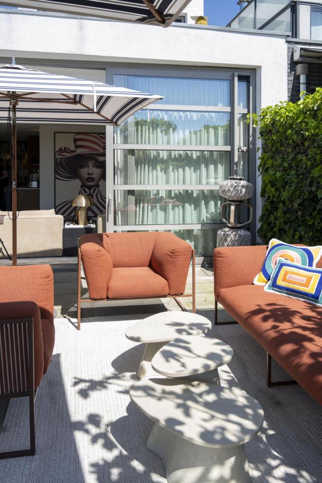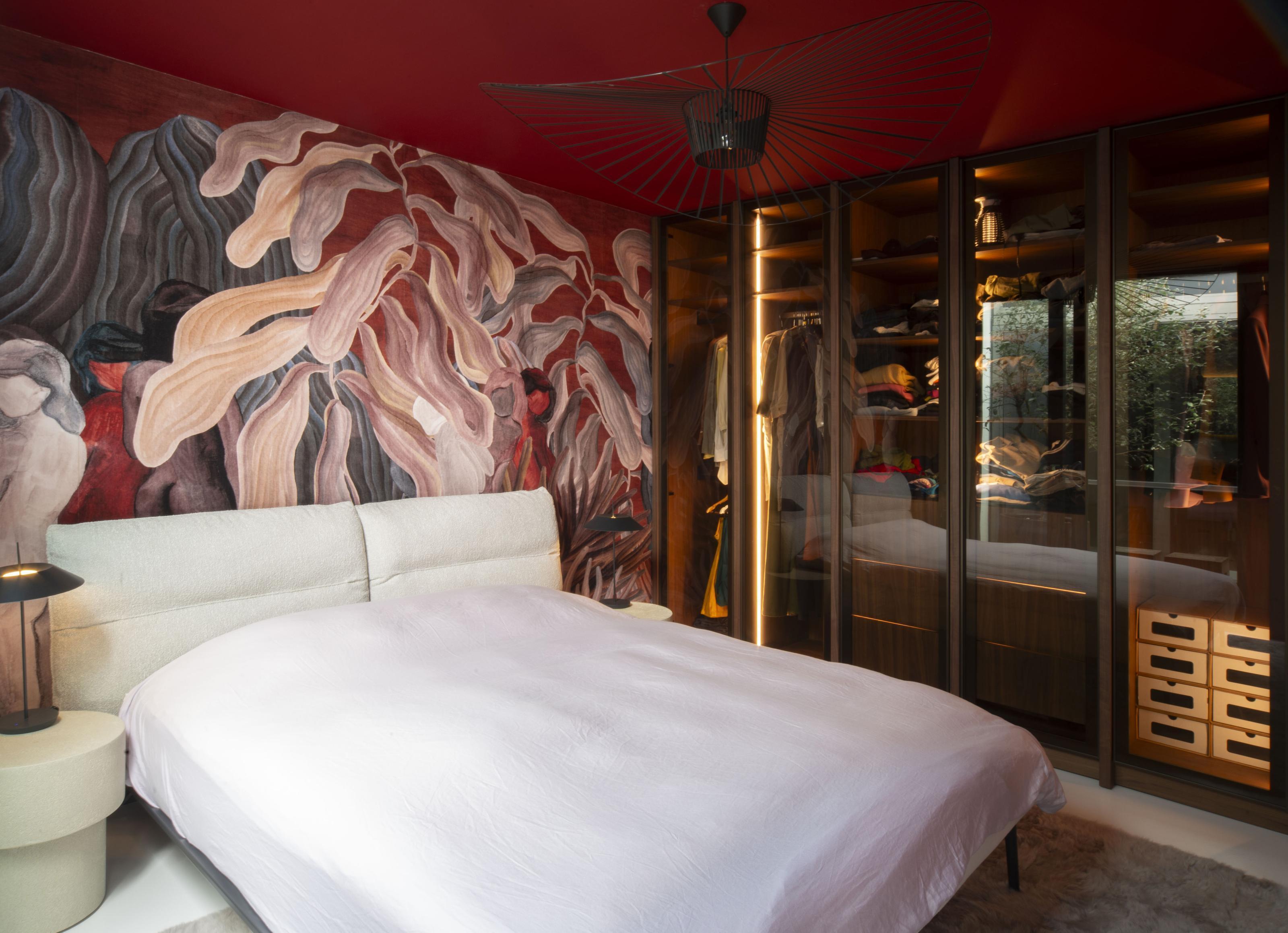 De warm notenhouten keuken nodigt uit tot uitgebreid koken en gezellig borrelen, zowel aan het eiland als op het bijpassende maatwerk zitbankje. Het behang op de muur achter de keuken versterkt de kunstcollectie, terwijl in de woonkamer een groot kunstwerk, geprint op een karpet, het centrale punt vormt. Een maatwerk tv-kast biedt bovendien stijlvolle opbergruimte voor accessoires.