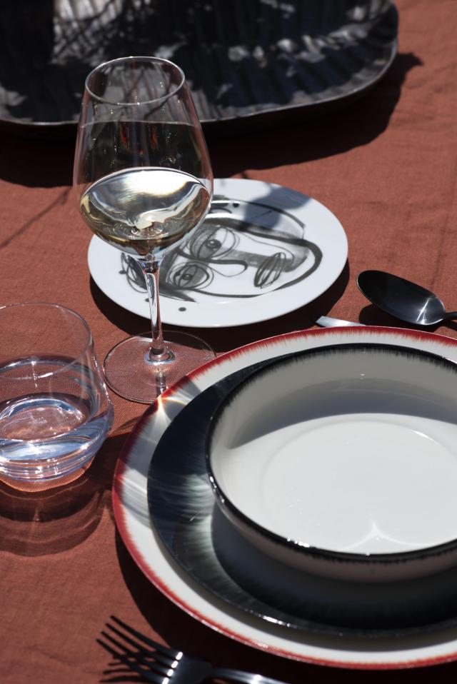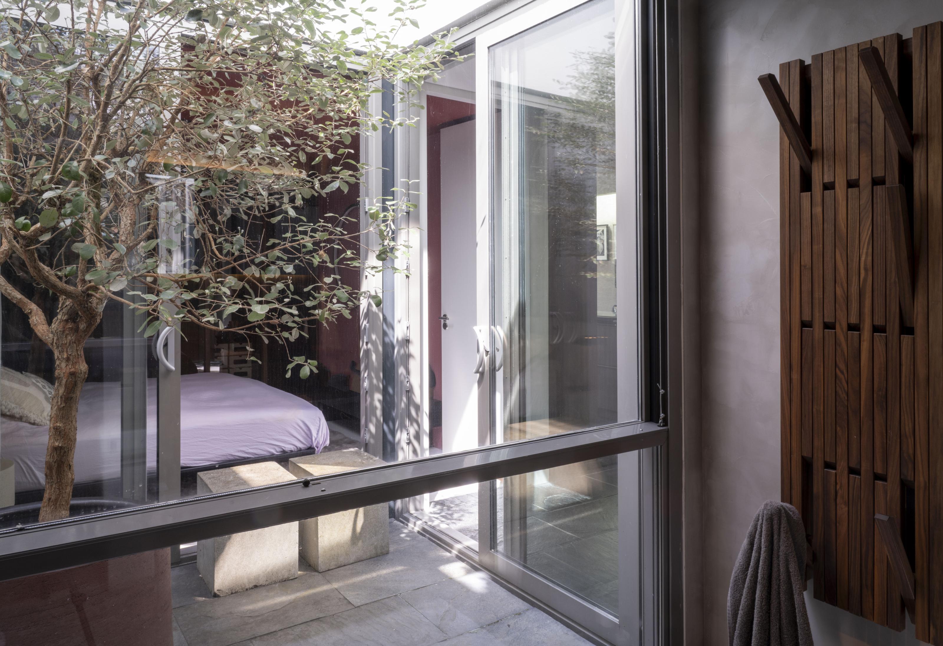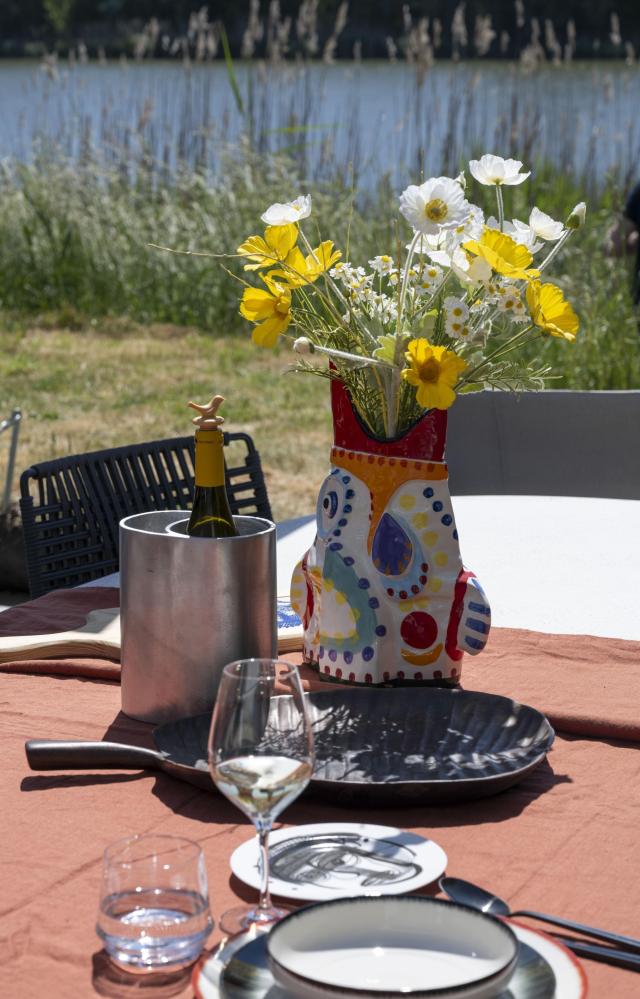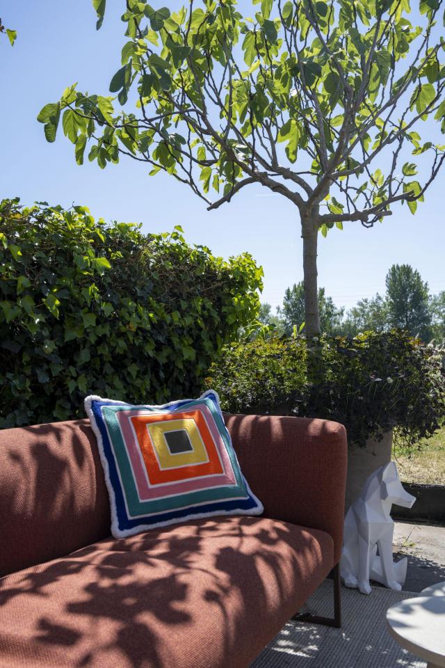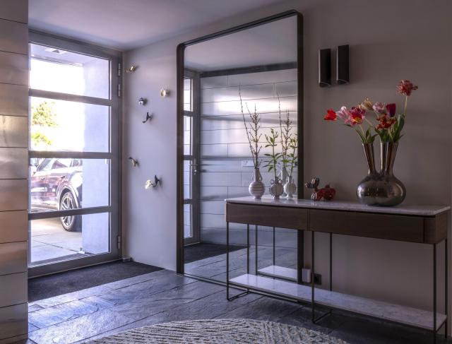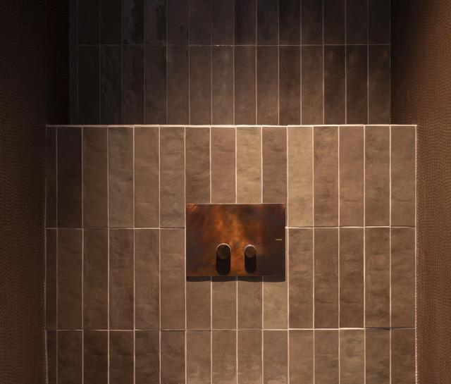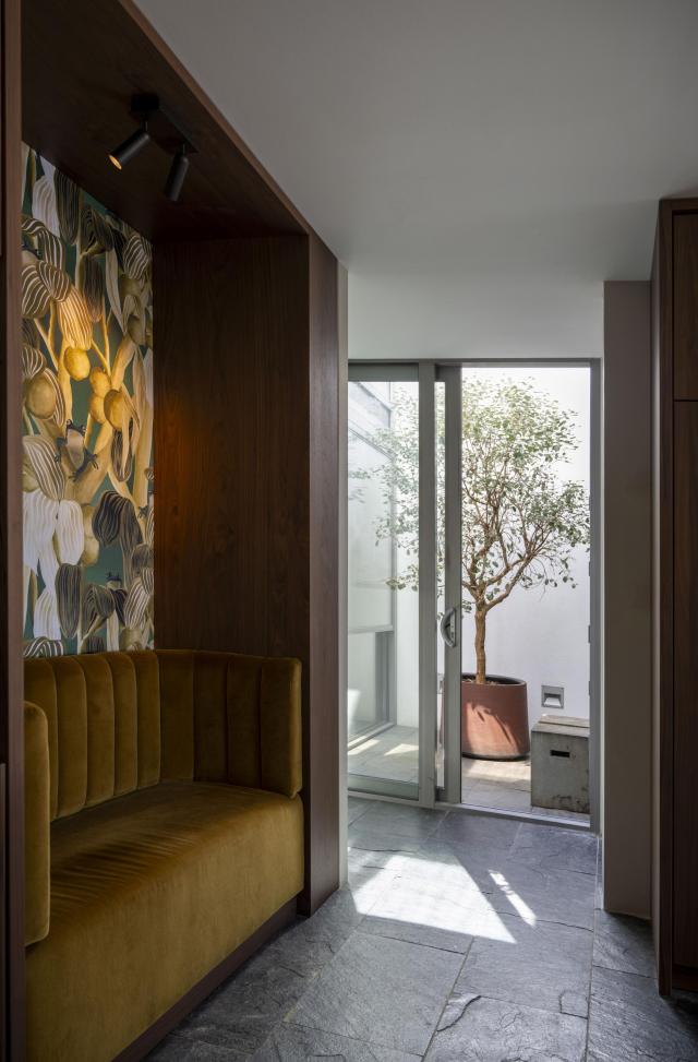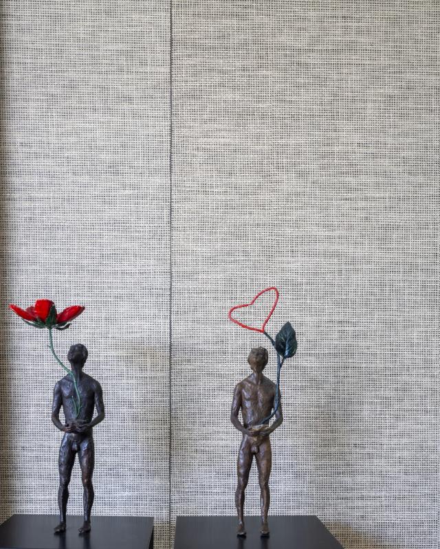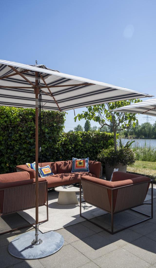 De warm notenhouten keuken nodigt uit tot uitgebreid koken en gezellig borrelen, zowel aan het eiland als op het bijpassende maatwerk zitbankje. Het behang op de muur achter de keuken versterkt de kunstcollectie, terwijl in de woonkamer een groot kunstwerk, geprint op een karpet, het centrale punt vormt. Een maatwerk tv-kast biedt bovendien stijlvolle opbergruimte voor accessoires.
