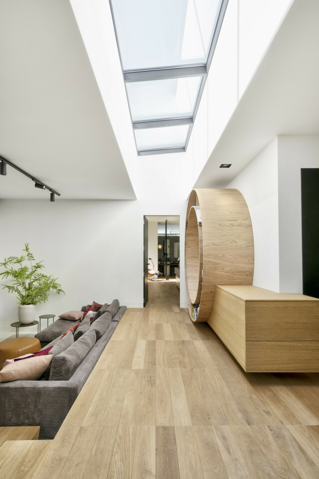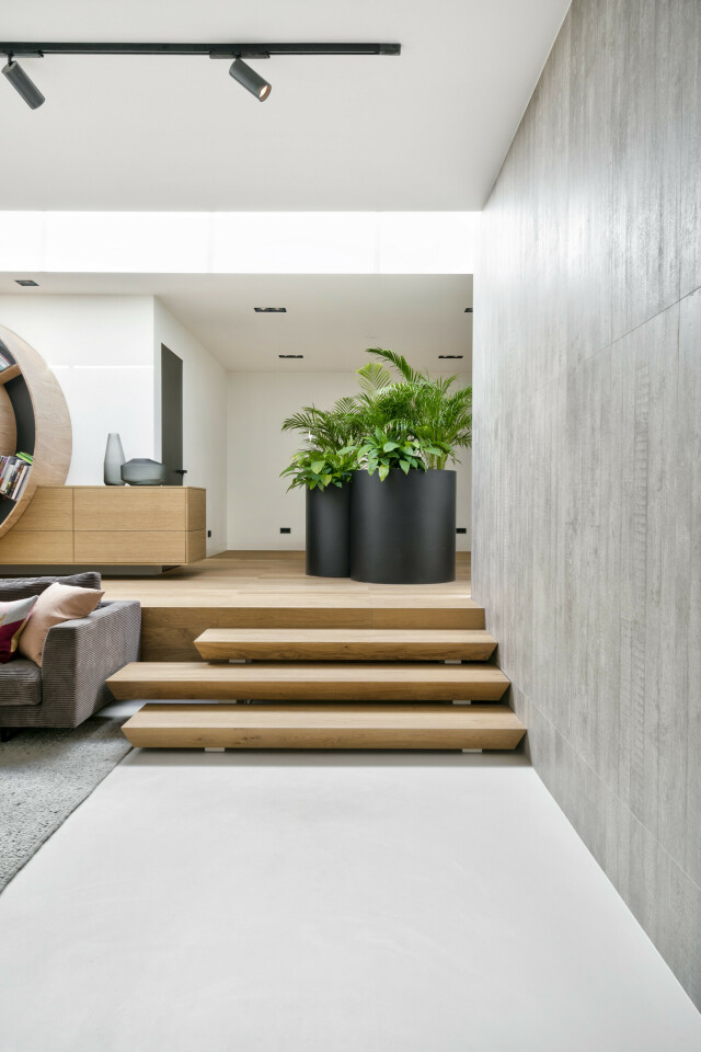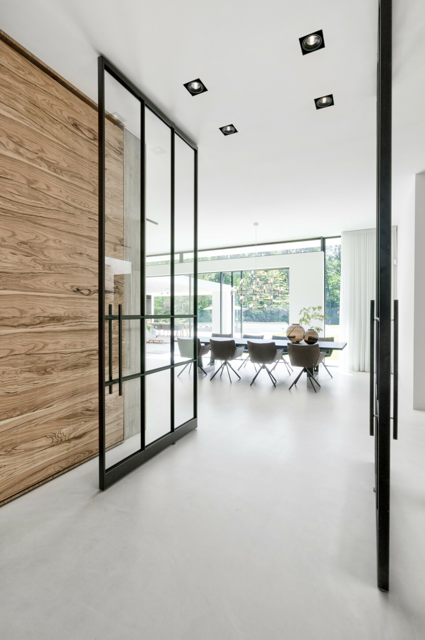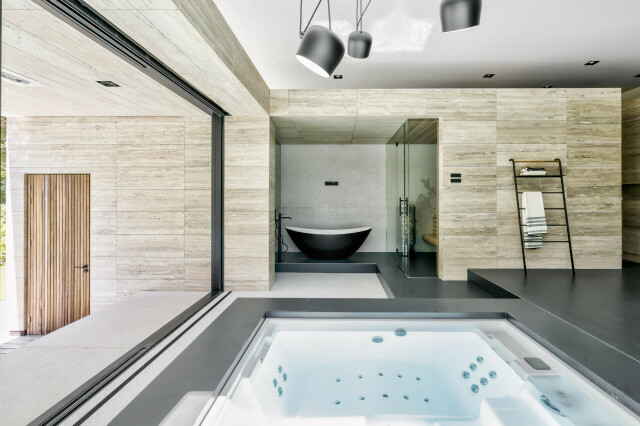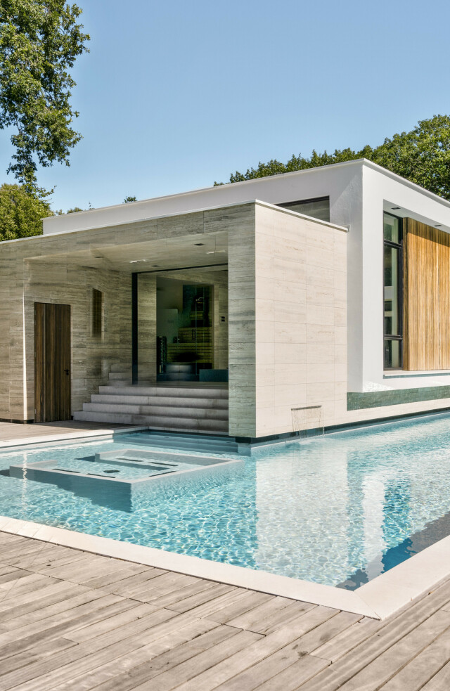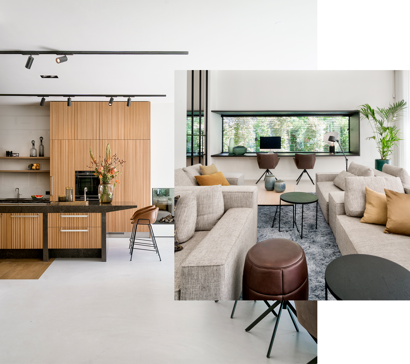 Duidelijke lijnen en stoere natuurlijke materialen maakten deel uit van de uitgangspunten voor de bouw van een prachtige split-level bungalow; een bungalow met vloeren op verschillende niveaus. De familie is op Curaçao gesteld geraakt op buitenleven. Door de overdekte patio’s die doorlopen en de mogelijkheid om de schuifpui helemaal open te zetten is dat, ondanks het frissere klimaat in Nederland, hier nog steeds mogelijk. Heerlijke luxe: vanuit de badkamer wandel je via een trapje zo het zwembad in. Binnen en buiten lopen naadloos in elkaar over.