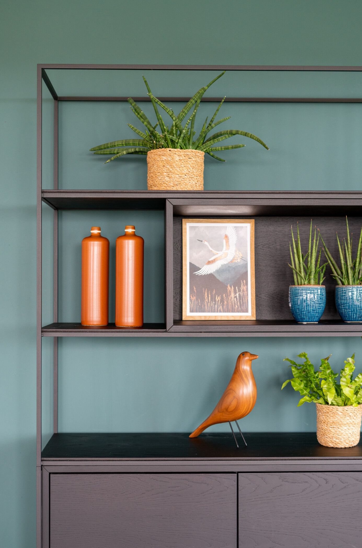 Creëer interesse met kunstwerken, kleine beeldjes of een opvallende eyecatcher. Plaats ze strategisch in grote open vakken voor een kunstgalerij-effect. Het is het beste om kleine elementen te groeperen, zodat er een verzameling ontstaat. Op die manier voorkom je dat hele kleine elementen 'verdwalen' in een kast als ze alleen staan.