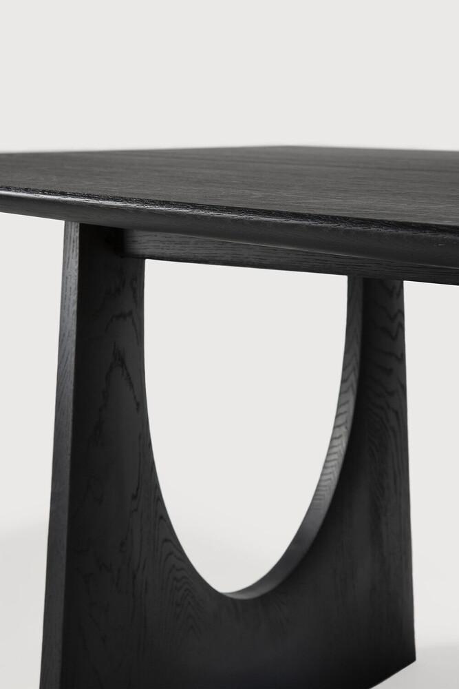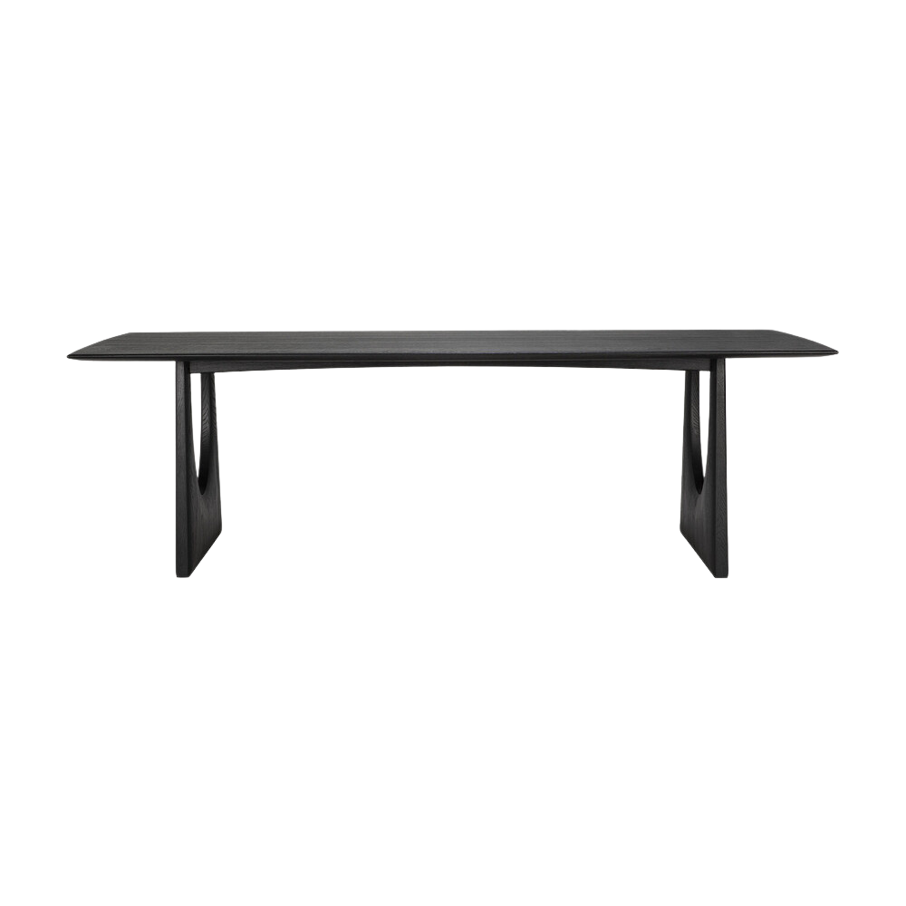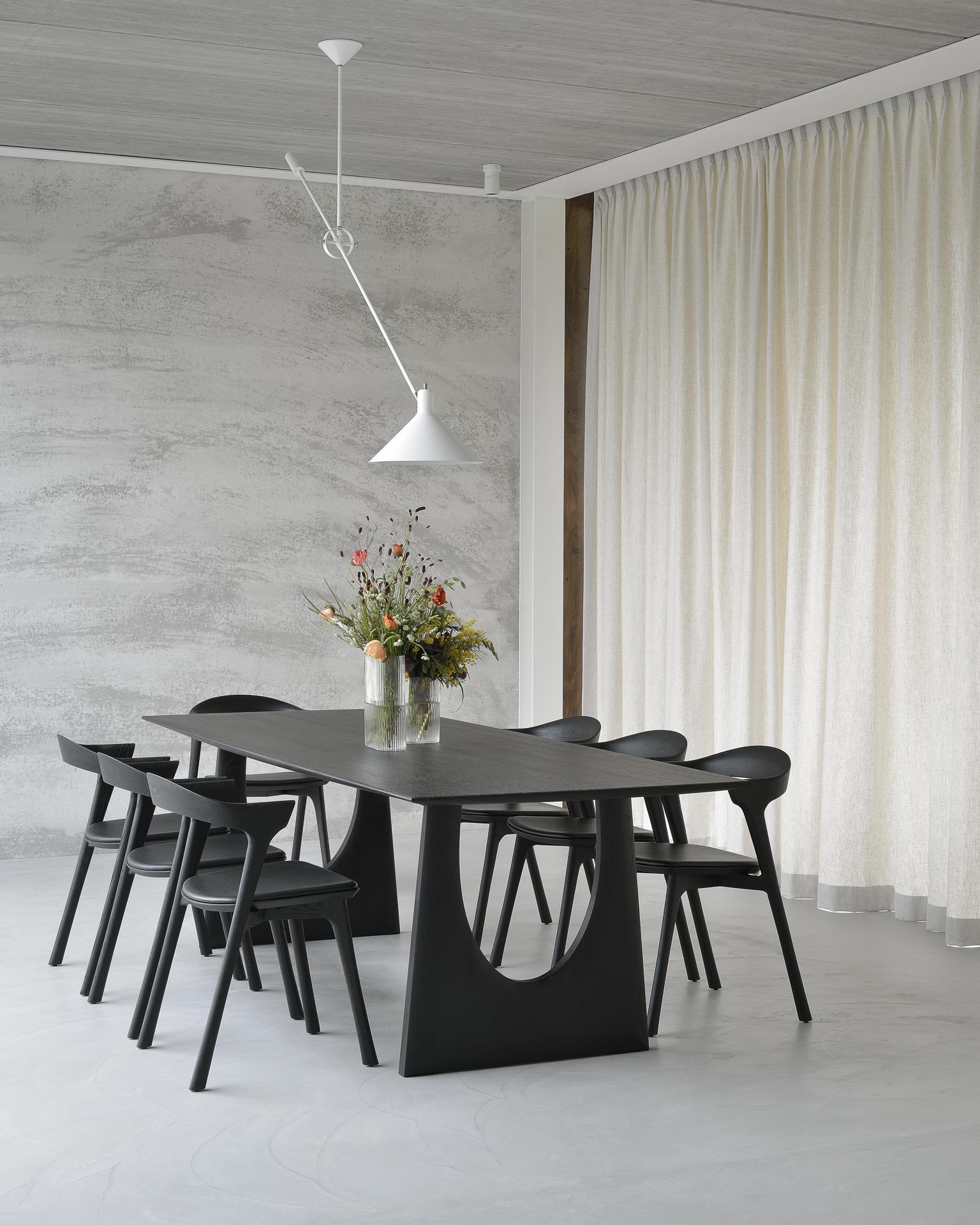 De Geometric massief eiken eettafel in Zwart Eikenhout, met zijn rijke vormen en onverwachte details, is een pronkstuk dat zich zowel in de eetkamer als op de werkplek thuis voelt. De luxueuze lengte wordt gebalanceerd door afgeronde randen en natuurlijke lijnen. De bijzondere vormen zorgen voor extra volume en praktisch comfort.