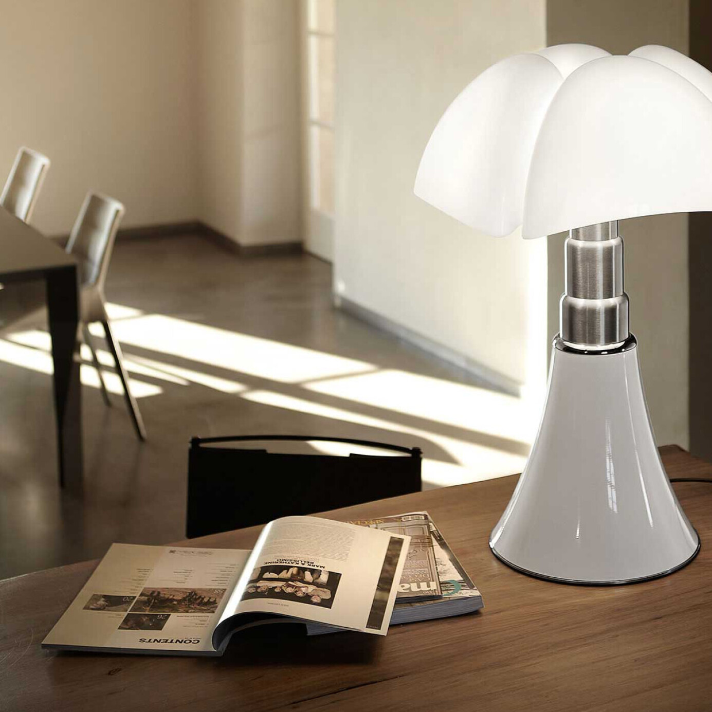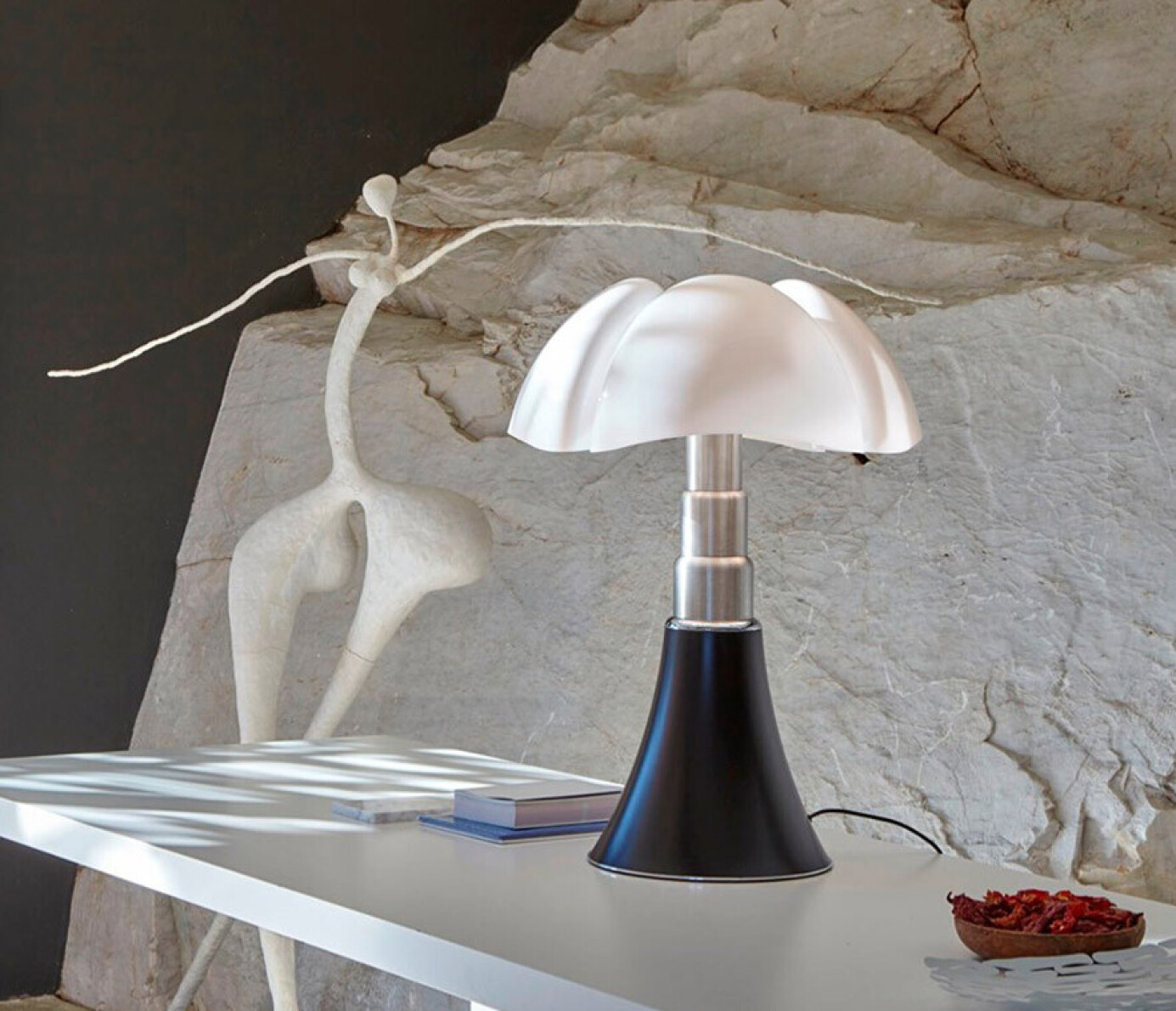 Tafellamp Pipistrello werd in 1966 ontworpen door Gae Aulenti voor het merk Martinelli Luce. Het meest bijzondere van de lamp is de kap, die doet denken aan de vleugels van een vleermuis (in het Italiaans: Pipistrello).