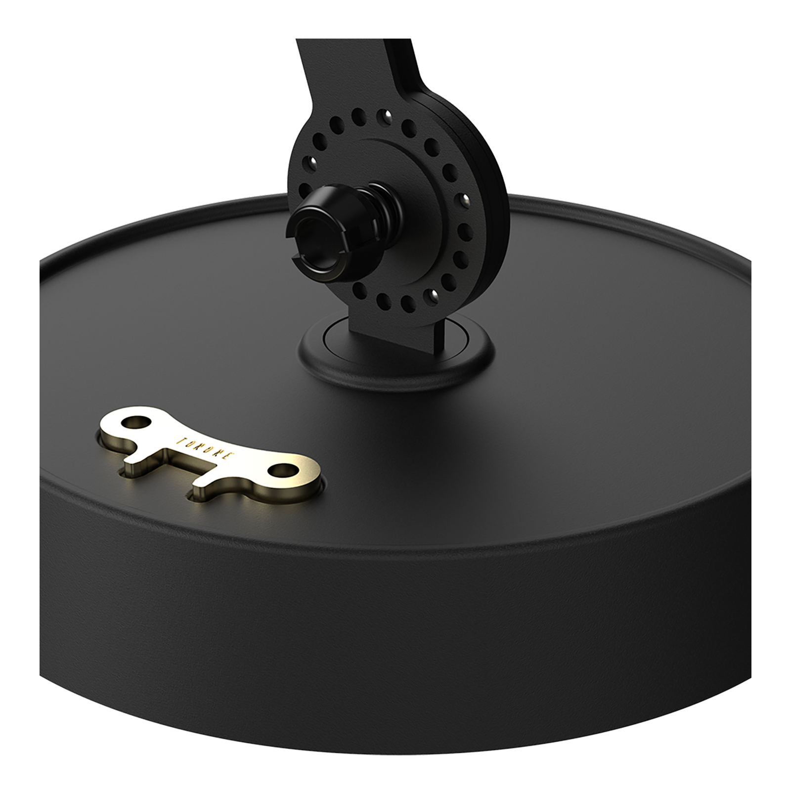 De Tonone Bolt Desk 2 arm is een ontwerp van Anton de Groof. De stoere industriële lampenserie BOLT is herkenbaar aan functionaliteit in vorm, strakke lijnen en aan de iconische hoofdrol voor de vleugelmoer. De Bolt serie is verkrijgbaar in 29 modellen. De bureaulamp kenmerkt zich door de twee verstelbare armen in gepoedercoat staal en een open kap uitgevoerd in gepoedercoat aluminium. De vleugelmoer oftewel de wingnut in massief messing wordt meegeleverd om de scharnieren naar eigen wens op 3 plaatsen te verstellen. Behalve dat het een functioneel hulpmiddel is, is de wingnut geïntegreerd in het ontwerp van de lamp en vormt het daardoor een onderscheidend visueel element van de lamp. De lamp is draaibaar en heeft een zware voet. De bureaulamp is ook verkrijgbaar met klem. Tonone Bolt bureaulamp in 11 kleuren: Smokey Black (zwart), Flux Green (groen), Pure White (wit), Ash Grey (lichtgrijs), Midnight Grey (donkergrijs), Lightning White (cremewit), Striking Orange (oranje), Thunder Blue (blauw), Daybreak Rose (roze) Ice Blue (blauw) en Sunny Yellow (geel).