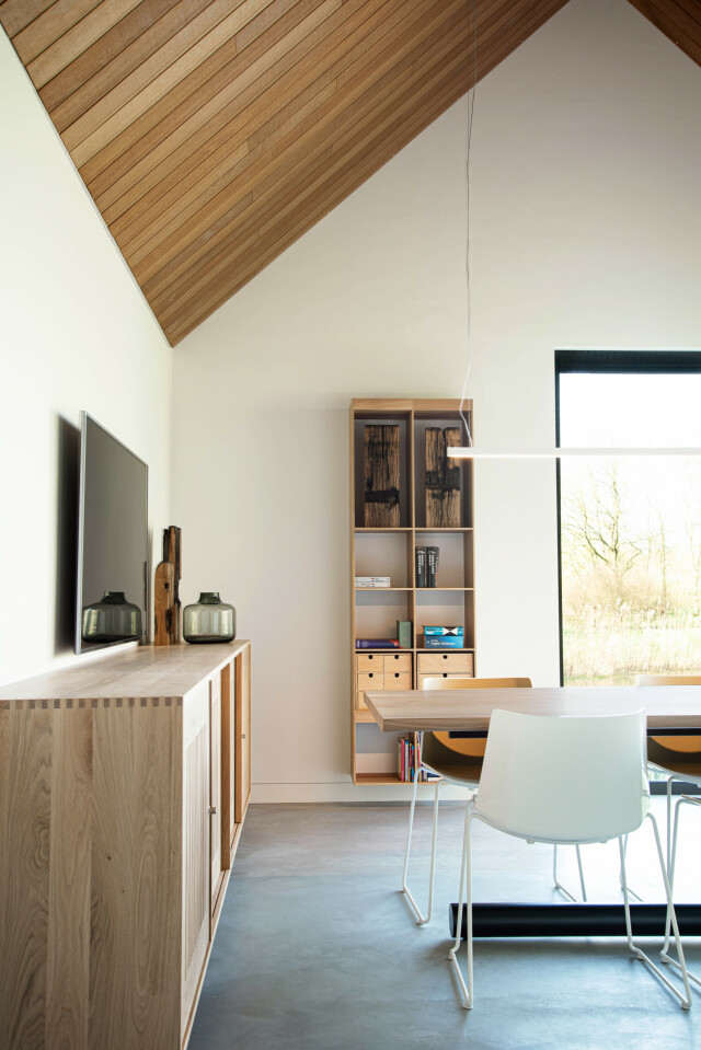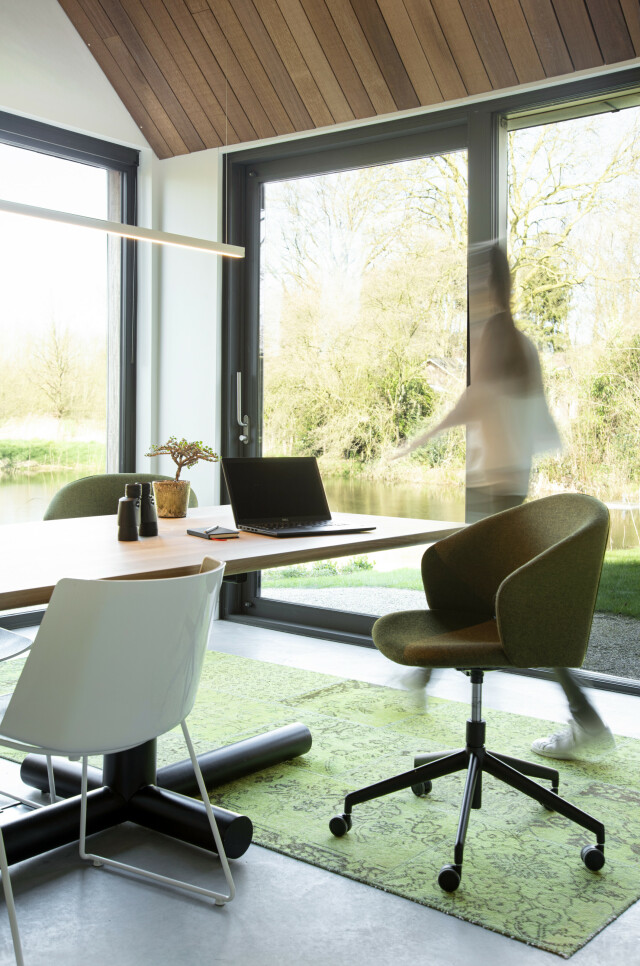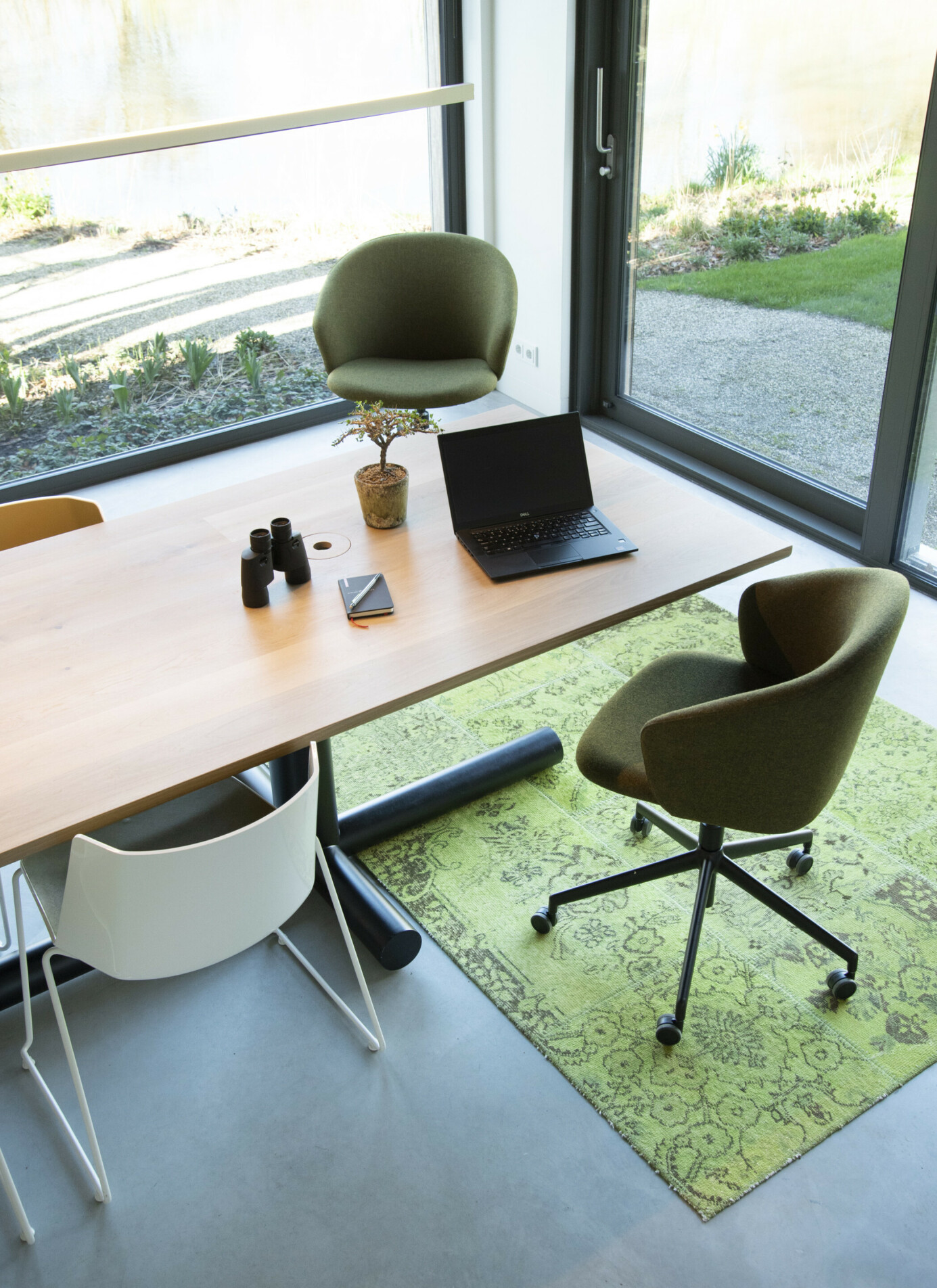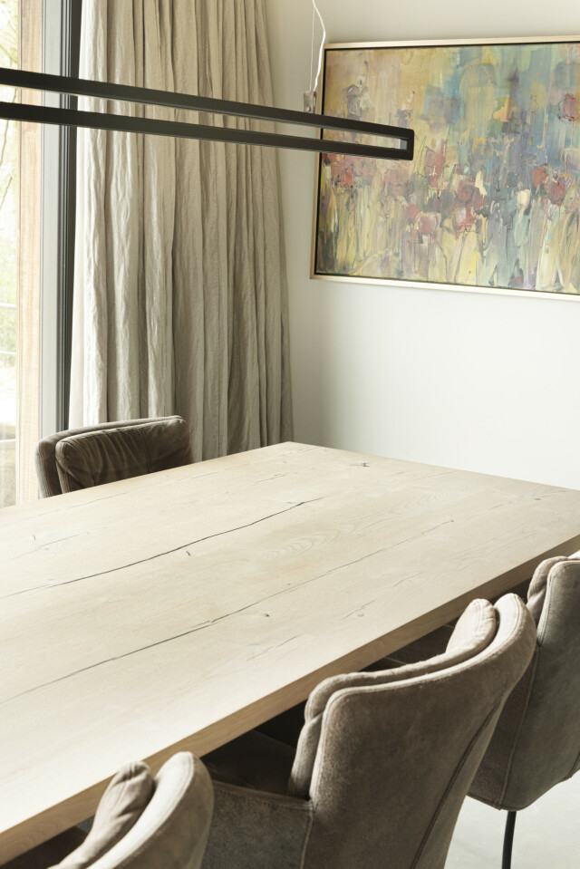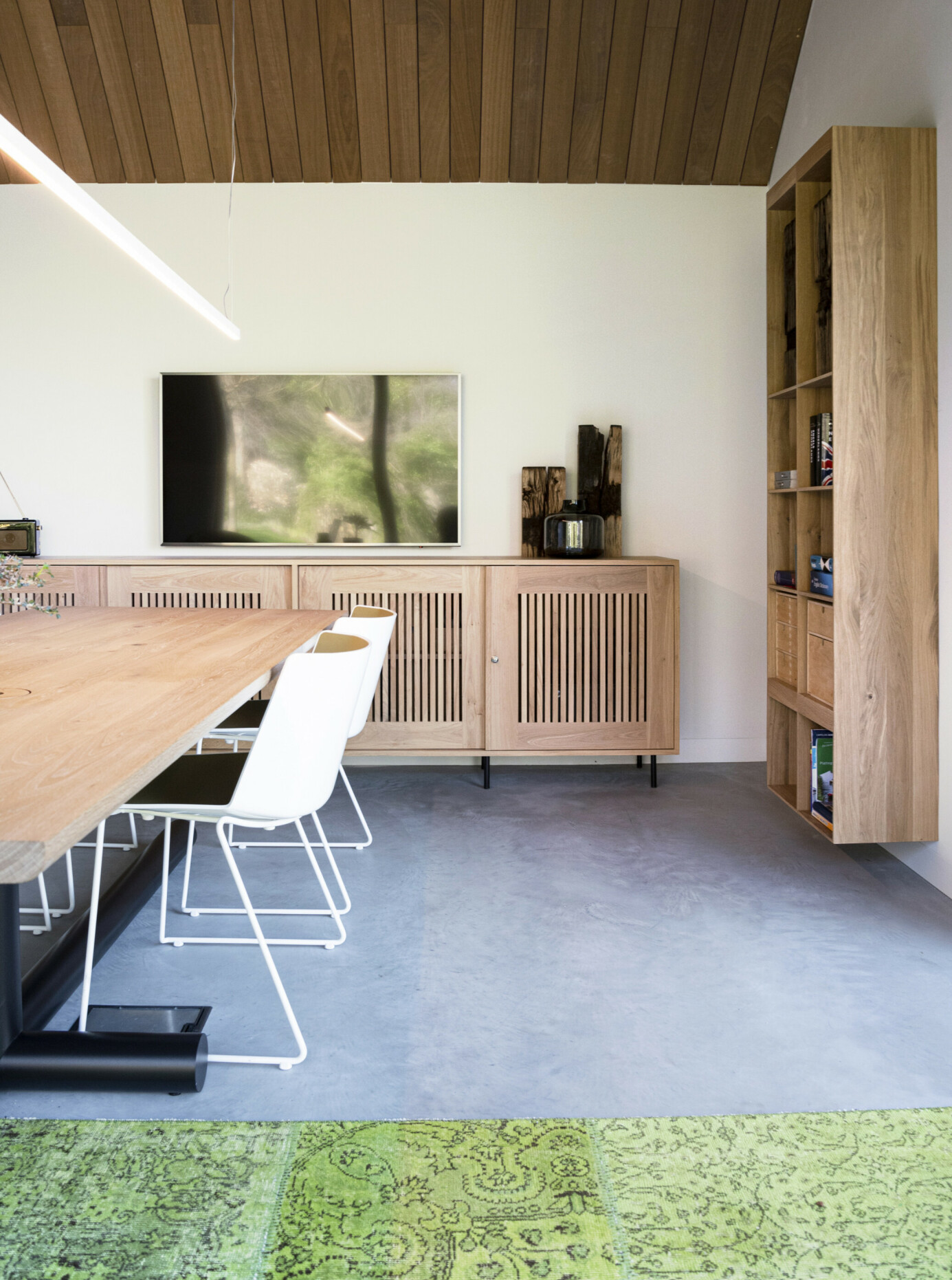 Denise kan vooral op dat gebied een grote bijdrage leveren. Op maat gemaakte kasten, tafels en karpetten worden in de ruimte ingetekend. Ook de afwerking en behandeling van het tafelblad is maatwerk. De wens is een glad, zacht oppervlak met toch een robuuste uitstraling. Na wat puzzelen vinden ze de juiste manier om dit resultaat te krijgen.