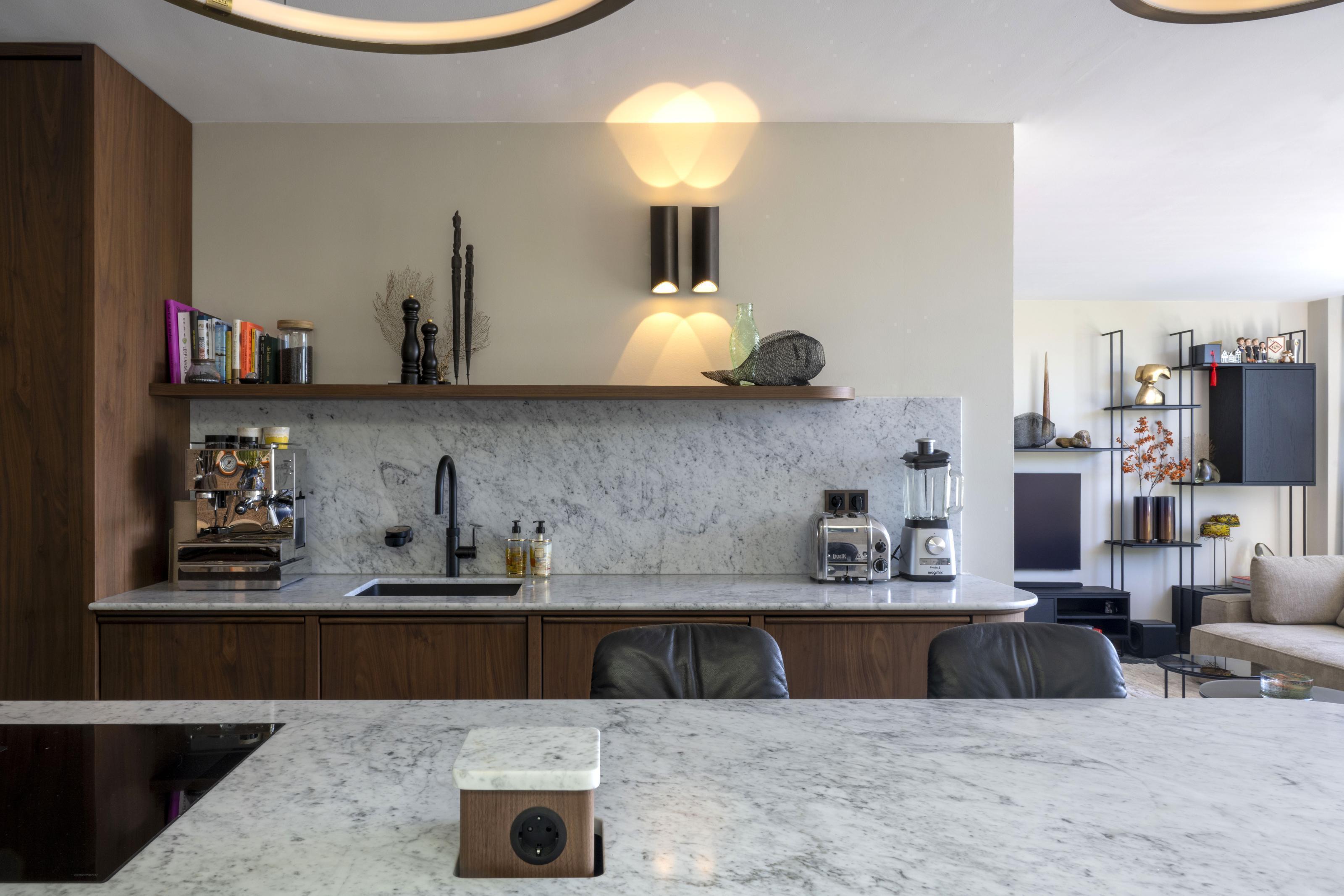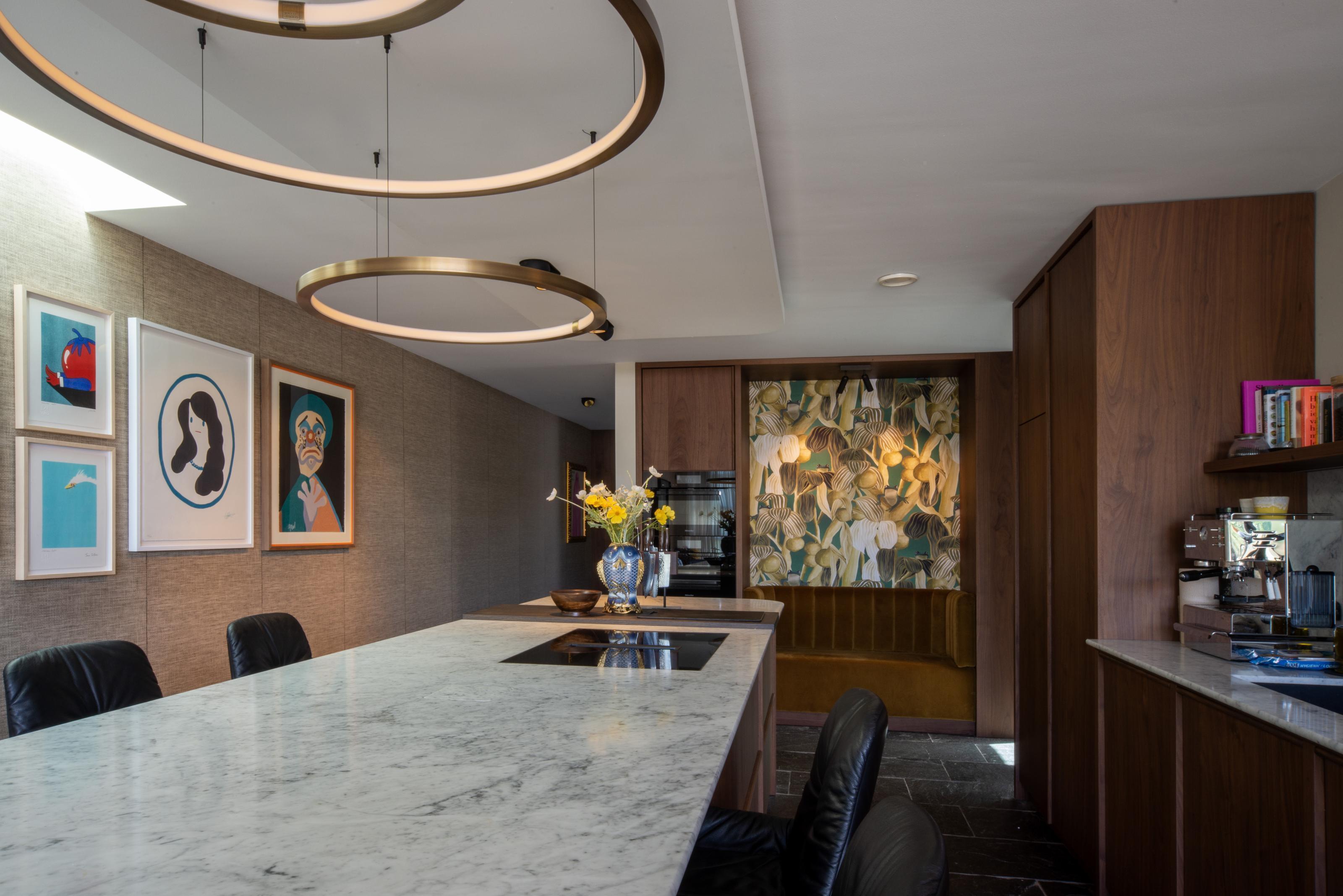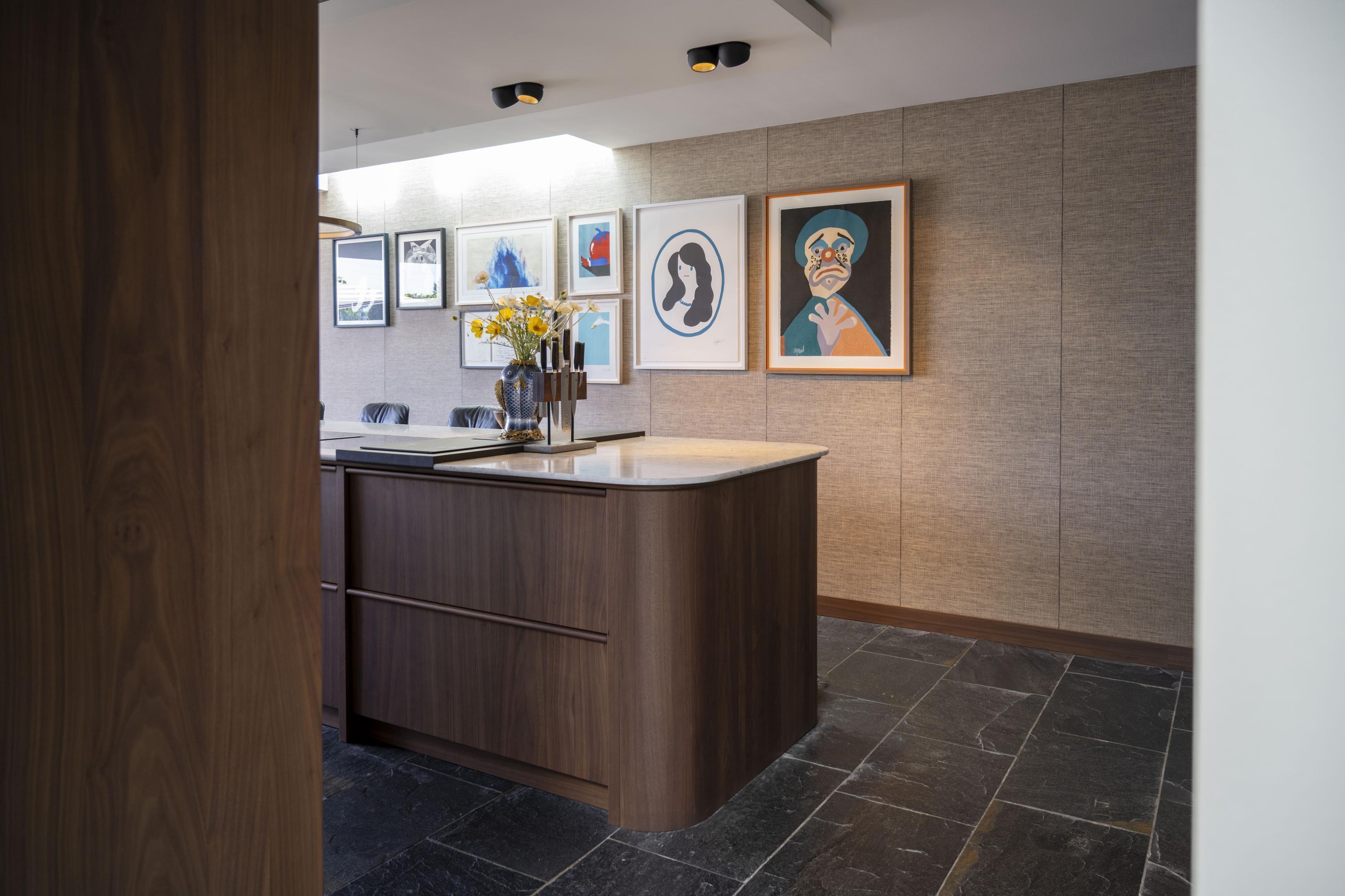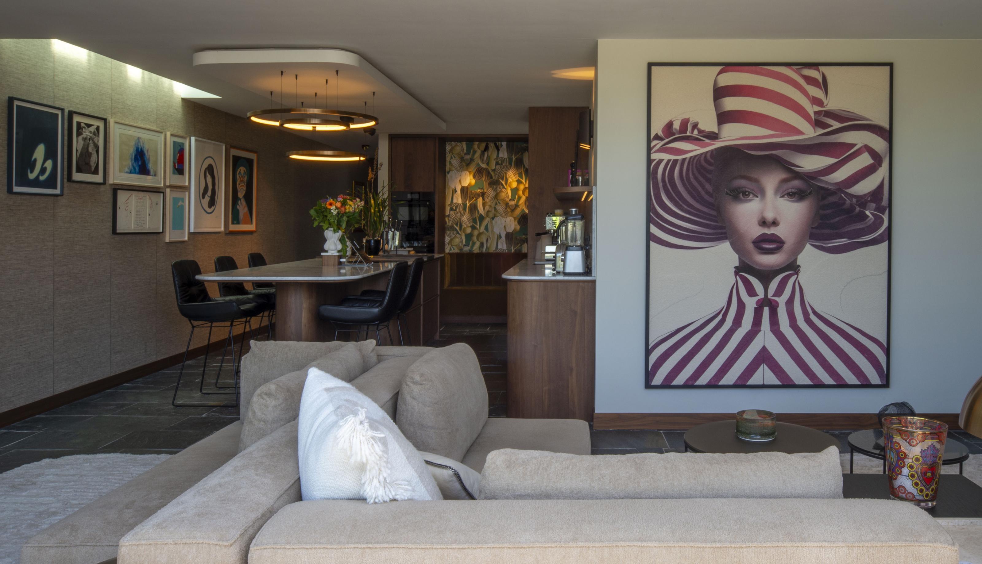 De warm notenhouten keuken nodigt uit tot uitgebreid koken en gezellig borrelen, zowel aan het eiland als op het bijpassende maatwerk zitbankje. Het behang op de muur achter de keuken versterkt de kunstcollectie, terwijl in de woonkamer een groot kunstwerk, geprint op een karpet, het centrale punt vormt. Een maatwerk tv-kast biedt bovendien stijlvolle opbergruimte voor accessoires.