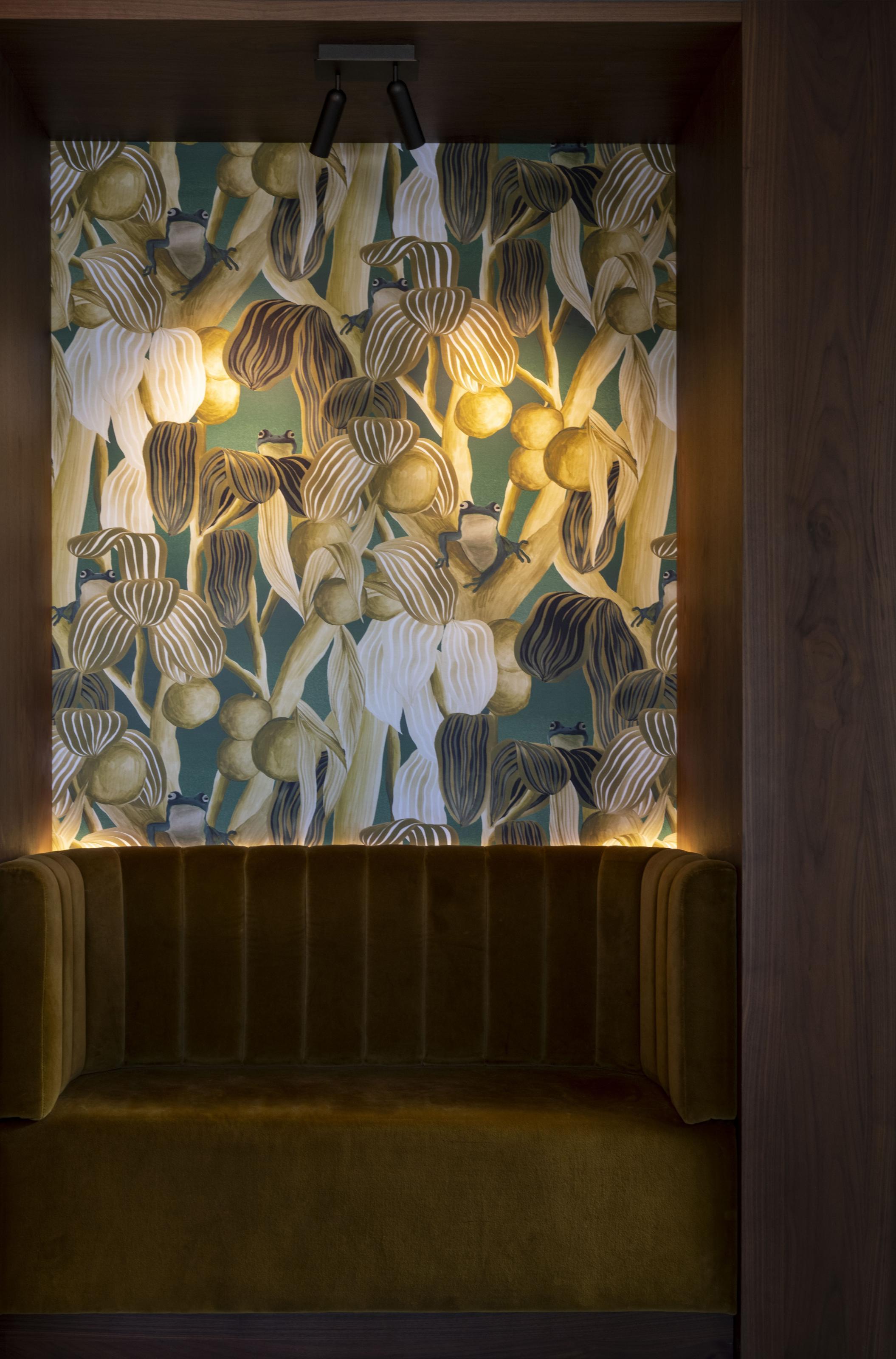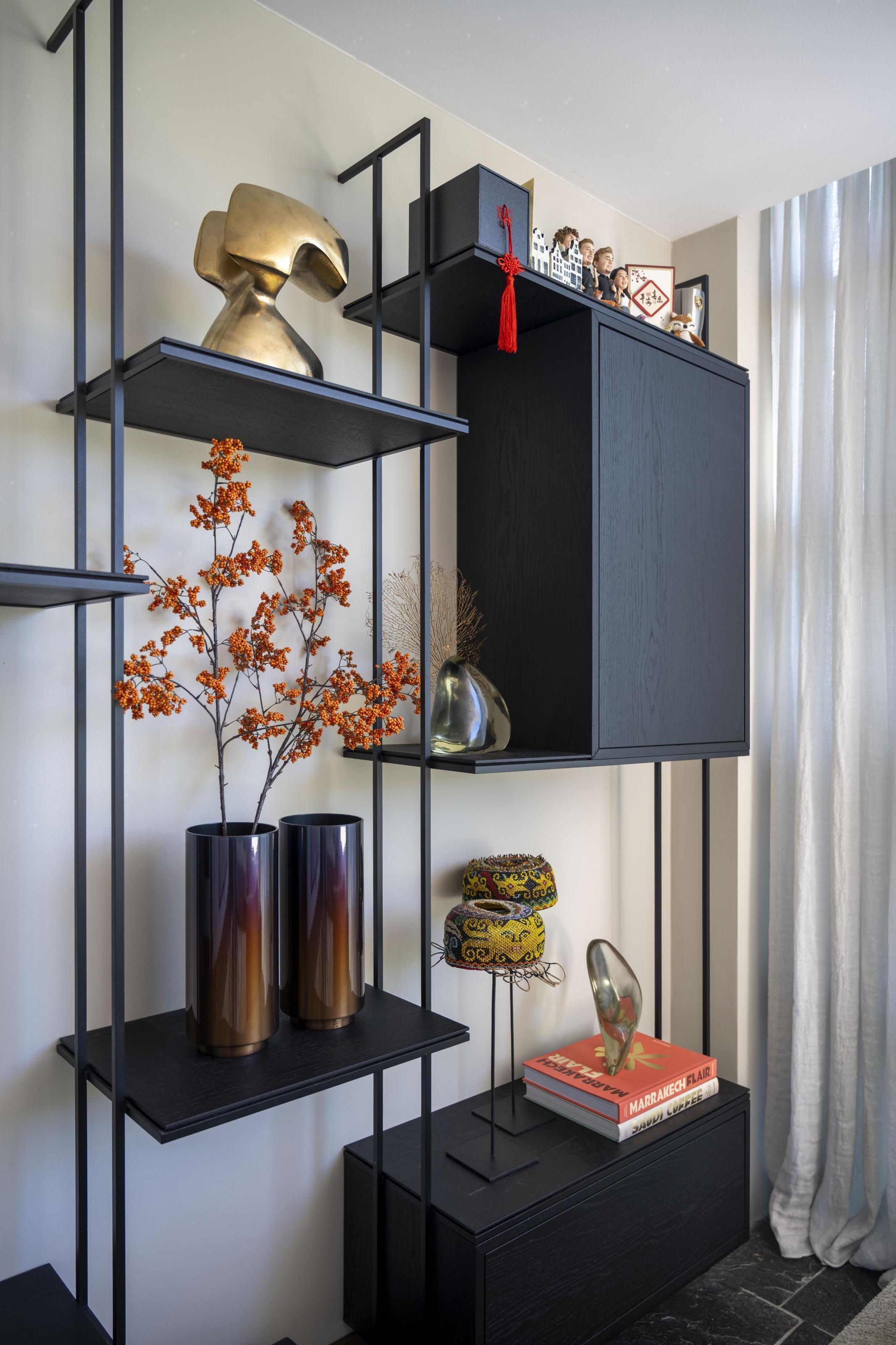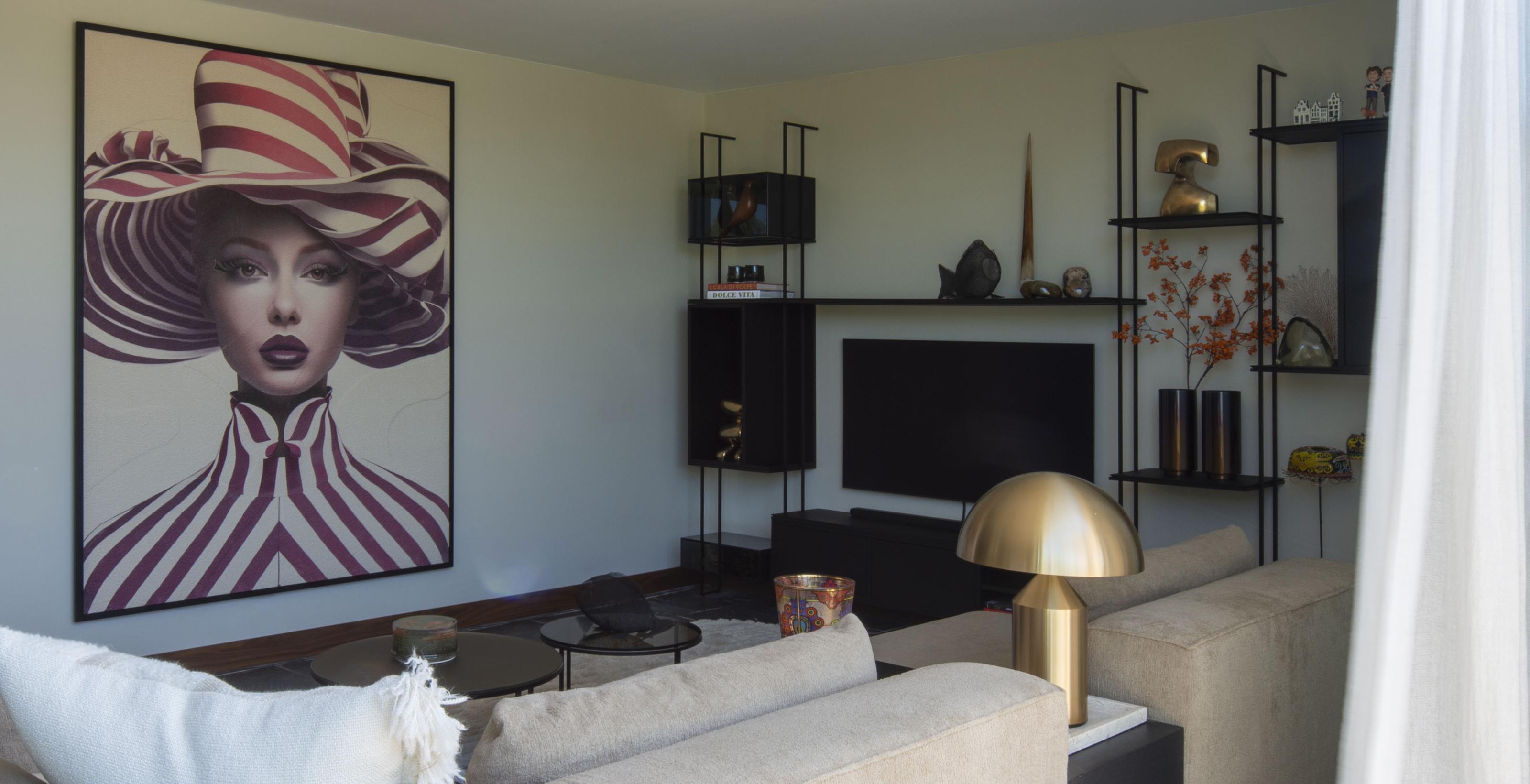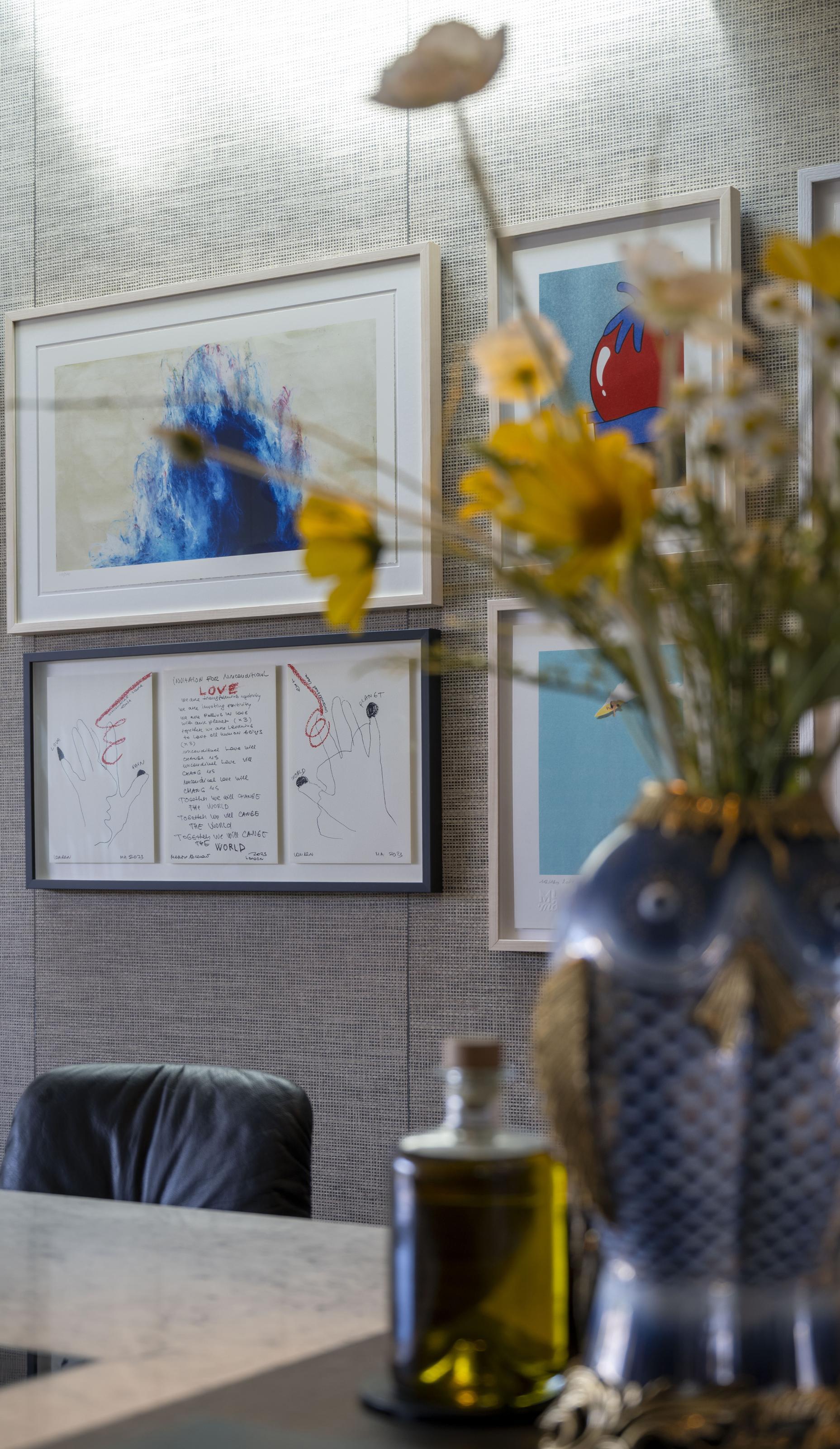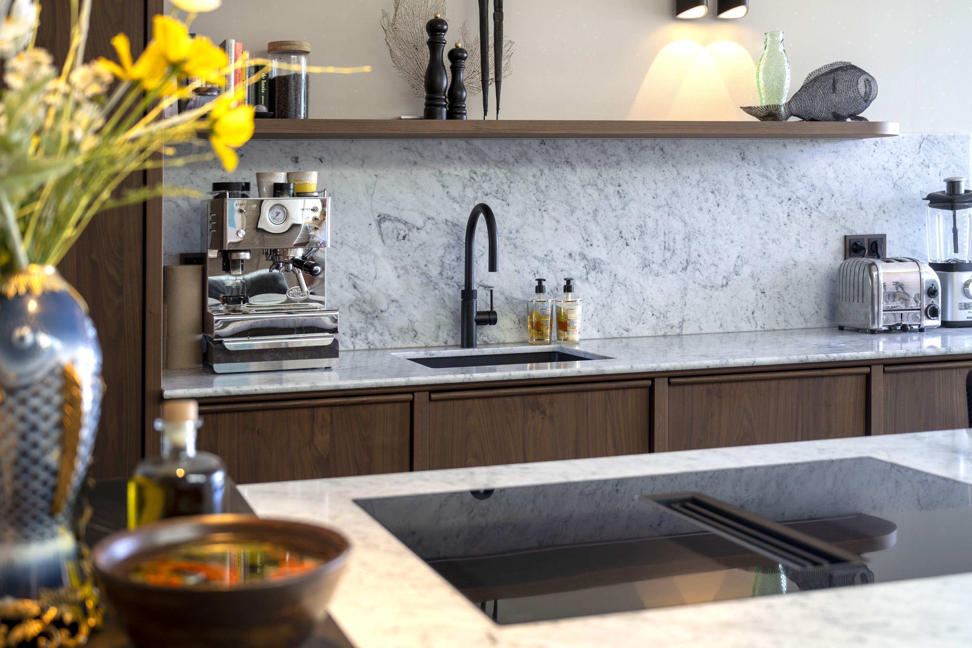 De warm notenhouten keuken nodigt uit tot uitgebreid koken en gezellig borrelen, zowel aan het eiland als op het bijpassende maatwerk zitbankje. Het behang op de muur achter de keuken versterkt de kunstcollectie, terwijl in de woonkamer een groot kunstwerk, geprint op een karpet, het centrale punt vormt. Een maatwerk tv-kast biedt bovendien stijlvolle opbergruimte voor accessoires.