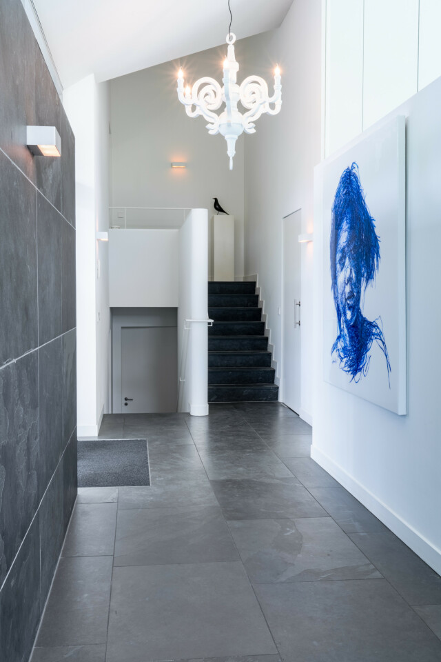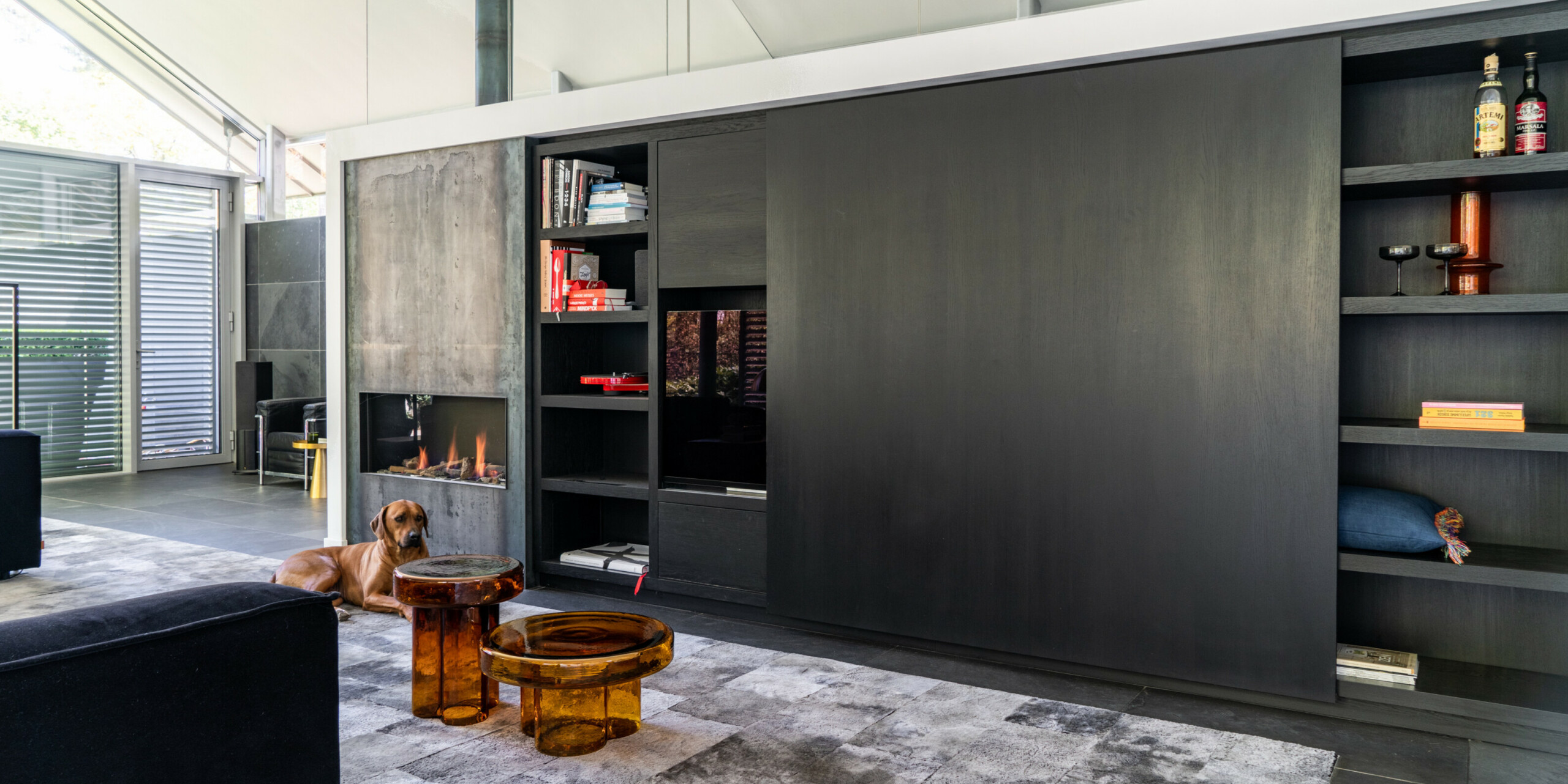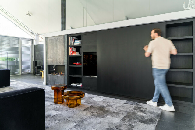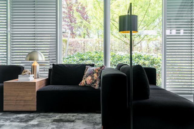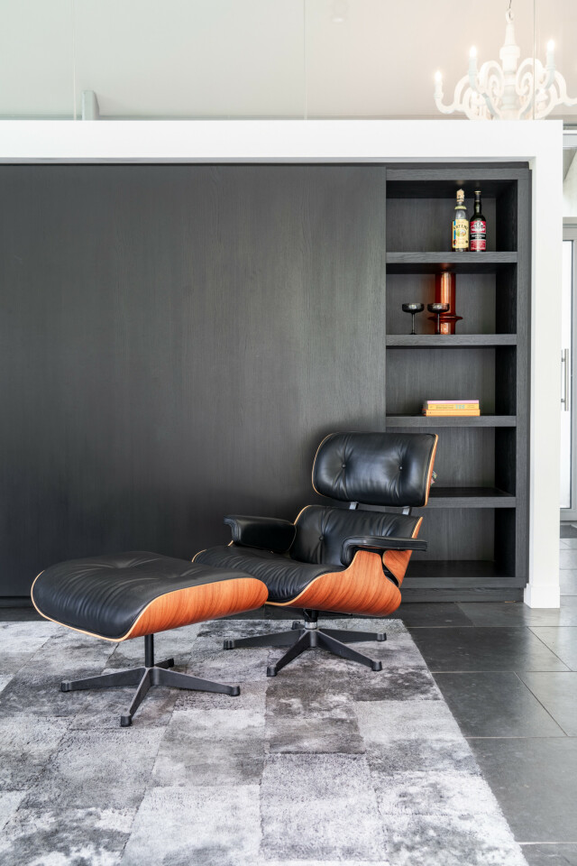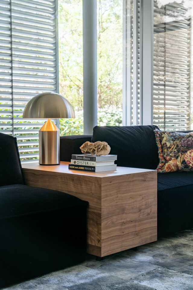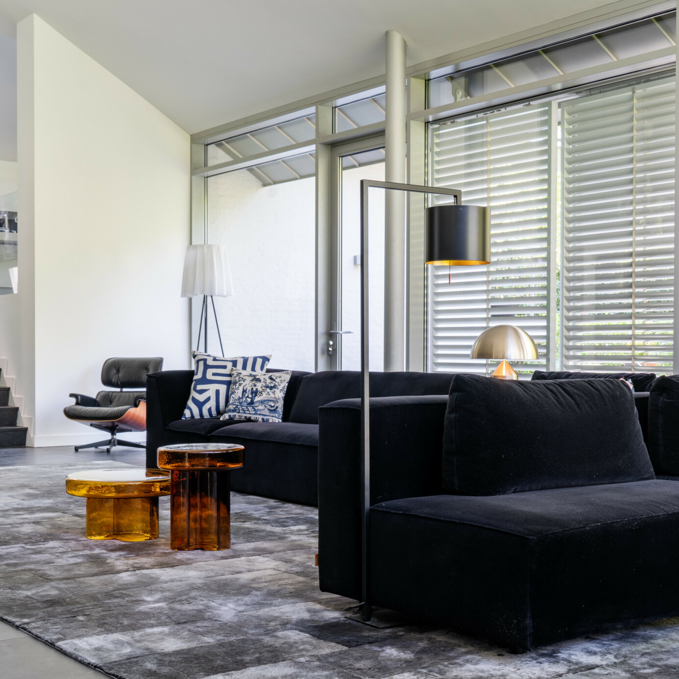 Gijs: ‘De woning is onder architectuur gebouwd met een benedenverdieping die bestaat uit één lange ruimte waarin TV-kamer, zitkamer, hal en keuken met elkaar verbonden zijn. Vloeren lopen over in wanden met grote raampartijen die zichtgeven op de tuin. Ze zijn voorzien van zonweringen waardoor er een bijzondere speling van licht en schaduw ontstaat.’ De bewoners gaan voor kwaliteit en ook de bank vormde een bewijs van hun goede smaak. Helaas bleek die niet zo comfortabel als verwacht. Gijs: ‘Hun zoektocht naar een nieuw zitmeubel vormde het startschot voor een aanpak van de gehele sfeer.’