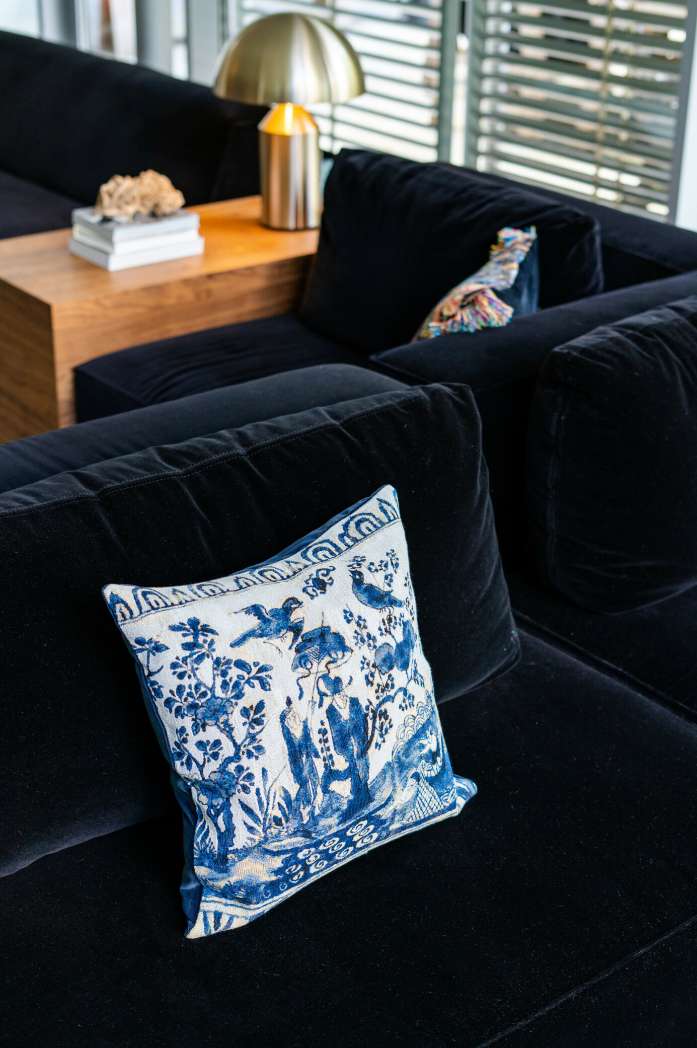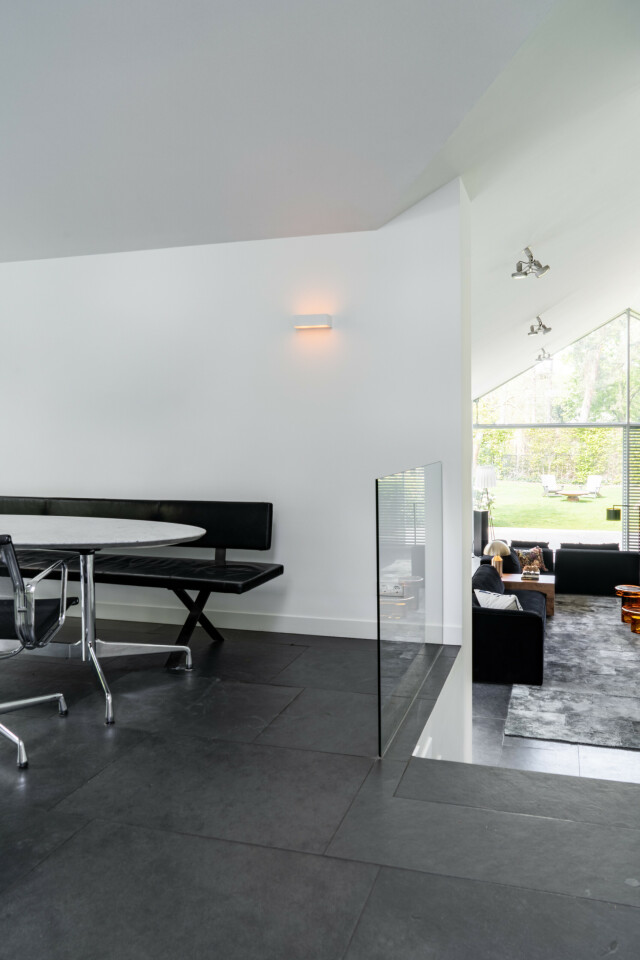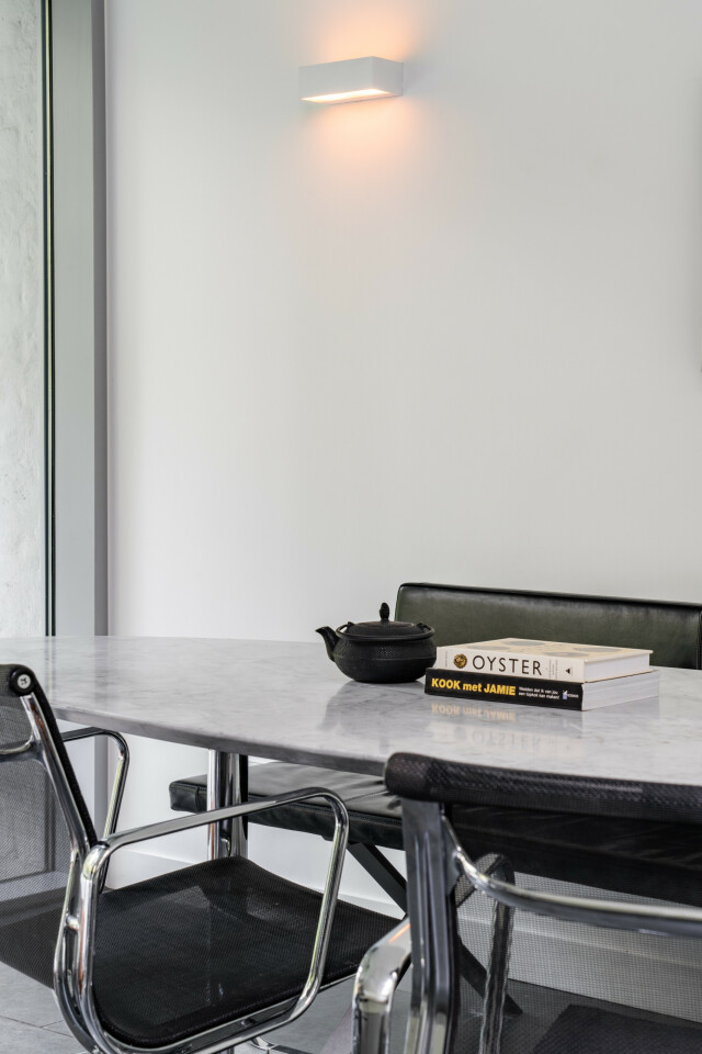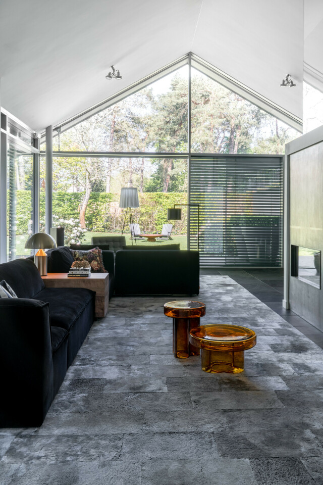 ‘We waren het erover eens dat de inrichting sober en genuanceerd moest blijven. Puur om de architectonische schoonheid te onderstrepen met mooie materialen en een aantal klassiekers. Teveel kleur zou die kunnen overschreeuwen. Omdat de ruimte al zo etherisch is, vervingen we lichte elementen voor donkere.’ Als eerste de bank. Die moest mooi zijn maar dit keer ook super fijn zitten. Gijs bedacht iets bijzonders: hij voegde banken van Montis en Gelderland samen tot één model en liet ze met dezelfde stof bekleden. ‘Hierbij trok ik nogmaals het thema ‘verbinding’ door’, vertelt hij. ‘De zitgroep maakt connectie met tv-kamer en haardpartij.’